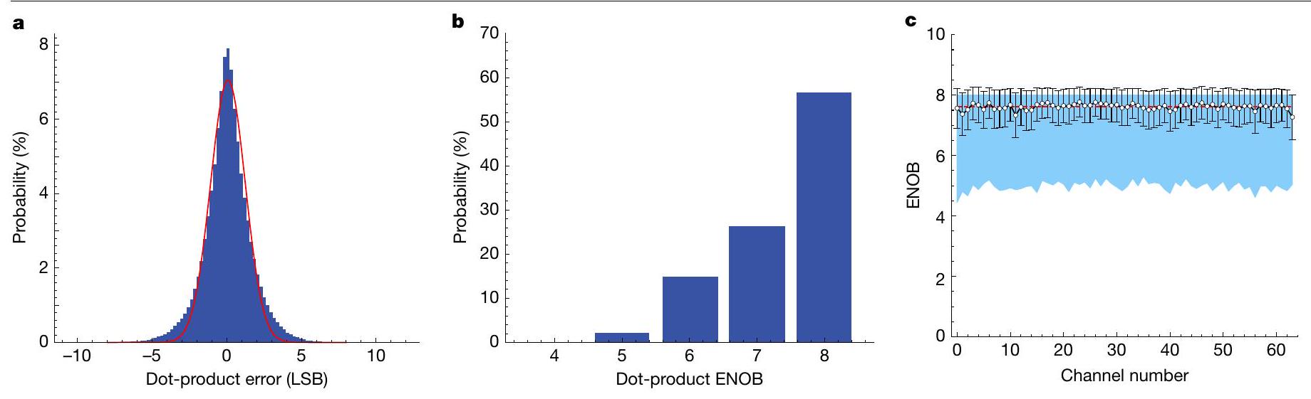 two different sets of weight matrix configurations that match our demonstrated workload, without any real-time active feedback tuning of the weights. An average error of 0.06 least significant bits (LSB) with standard deviation is achieved (for another result for randomized weight configurations, see expended characterization in Supplementary Note C and Extended Data Fig. 4). Correspondingly, the effective number of bits (ENOB) distribution reaches 8 bits for more than probability and more than 7 bits for greater than , as shown in Fig. 3b. The channel-to-channel bit accuracy presented in Fig. 3c also reveals that an average of close to 7.61-bit accuracy is achieved in the system under 25 MHz data rate, without any active feedback control. A specific preliminary calibration is applied to maintain the system accuracy. The system is also tolerant to temperature fluctuation with downgrade of an effective bit (see Supplementary Note B). The ambient temperature dependence can be mitigated and the bit accuracy is expected to be further improved with active feedback control and monitoring of the system implemented.
