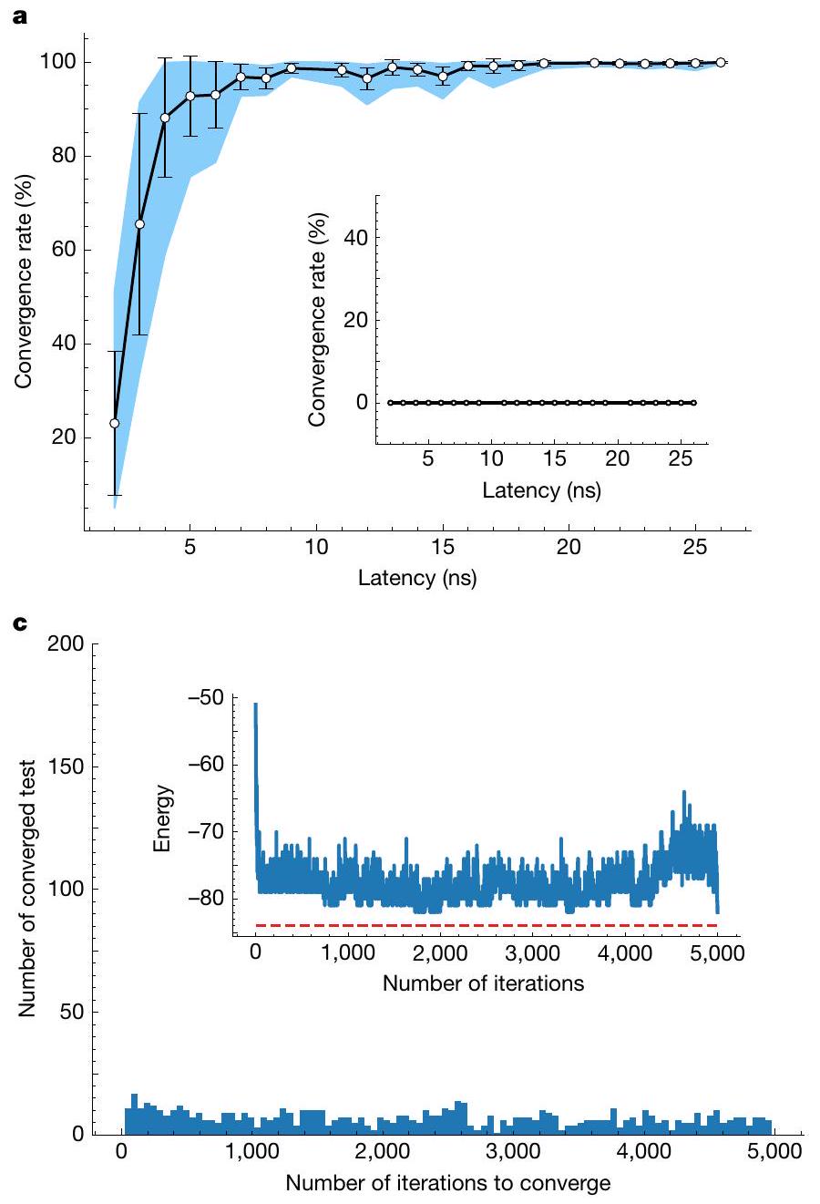 ثم نقوم بتوصيف أداء نظامنا في حل مشاكل إيسينغ (انظر الطرق، الملاحظة التكميلية A والشكل 5 من البيانات الموسعة). يتم ضبط ساعة النظام على 1 جيجاهرتز (انظر الملاحظة التكميلية A) ويمكن تكوين زمن التأخير في كل حلقة من 1 إلى 26 نانوثانية. يتم تسجيل النتائج من جميع التكرارات في ذاكرة النظام. مع عشرة دفعات من 2000 اختبار تقارب إيسينغ، فإن متوسط معدل التقارب للعثور على أفضل الحلول هو أكثر من مع أدنى زمن تأخير يبلغ 5 نانوثانية، كما هو موضح في الشكل 5a. ينخفض متوسط نسبة التقارب إلى أقل من عند زمن تأخير يبلغ 2 نانوثانية، بسبب القيود الداخلية للتأخير التي تفرضها دورات معالجة الإشارة بالإضافة إلى سرعة الساعة. يمكن رفع أو تحسين هذا القيد من خلال استخدام تصميم جهاز بديل مع عرض نطاق ترددي أعلى وسرعة ساعة أعلى مع تصميم دوائر أكثر إحكامًا في كل من EIC وPIC.يمكن أن يصل معدل التقارب إلى ما يقرب من مع إعداد زمن تأخير أكبر في النموذجين المعروضين. يشير ذلك إلى أن زمن حساب نظام PACE يمكن أن يحقق حدًا أدنى قدره 5 نانوثانية. هذا أسرع بنحو 500 مرة من تكرار واحد عند تشغيل نفس الحمل على وحدة معالجة الرسوميات التجارية عالية الأداء NVIDIA A10، والتي تم قياس زمن تأخير أكبر من .