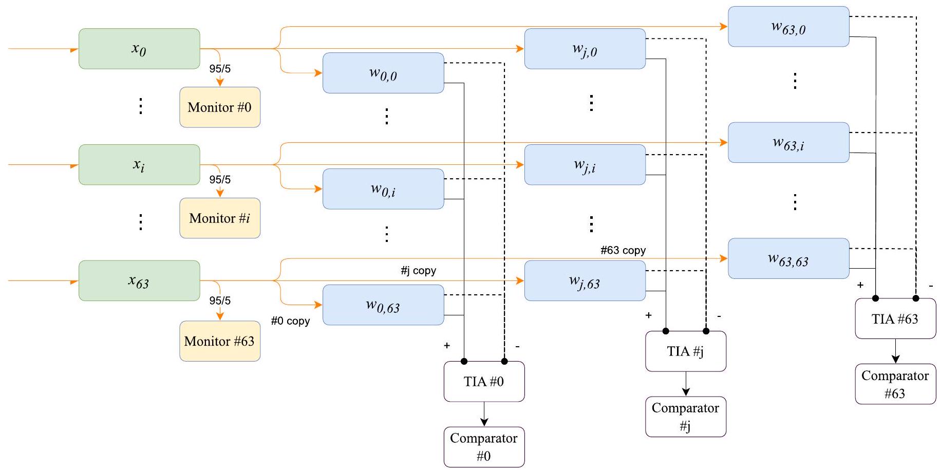 Extended Data Fig. 1 | Architecture of the PACE matrix-vector multiplier. The orange lines represent the optical signals and the dashed and solid black lines represent the electrical signal. The solid or dashed lines before entering the TIA represent a pair of differential signals.