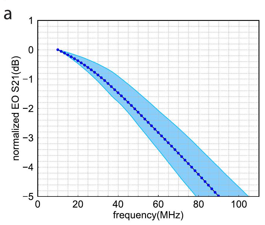 Extended Data Fig. 2 | The electrical-to-optical/optical-to-electrical response of the modulator and photodetector. a, S21 response of the weight modulator used in the PIC.b, S21 response of the photodetectors used