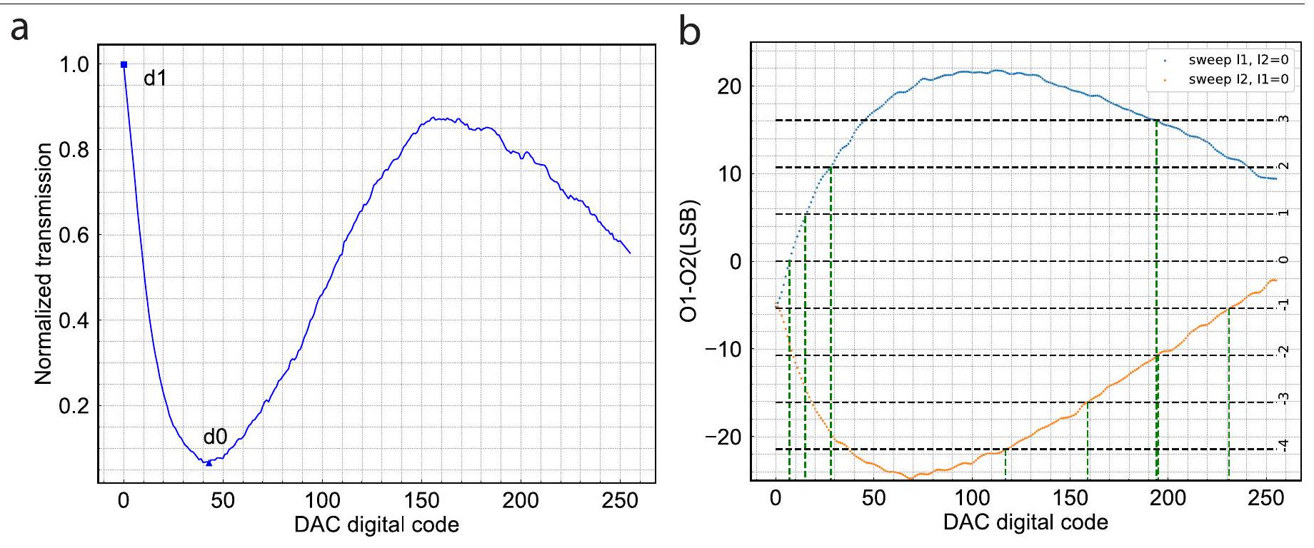 Extended Data Fig. 3 | Calibration of vector element and matrix element. a, Normalized transmission curve of the DAC digital code sweeping for a vector element channel. b, Purified curve of a matrix element and also the mapping from numerical value ( -4 to 3 ) to DAC codes.