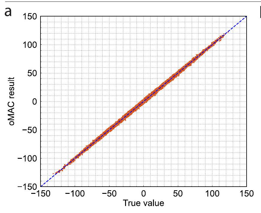 Extended Data Fig. 4 | Matrix-vector multiplication accuracy. a, oMAC results versus true values. The dashed line corresponds to the function ‘ and the orange points are the oMAC calculation results. , Distribution of