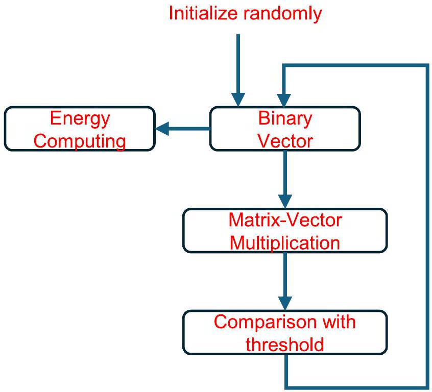 في هذا العمل، نستخدم فئة من الخوارزميات التكرارية الاستدلالية التي تم اقتراحها كنهج فعال لحل مشاكل إيسينغ باستخدام الفوتونيات المتكاملة . في تنفيذ الأجهزة الضوئية، من الضروري تحويل متجه الدوران إلى متجه ثنائي ، حيث يتم تعريف كل عنصر على أنه . سيتم بدء هذا المتجه الثنائي عشوائيًا ثم يتم تكراره. تتضمن كل تكرار من الحلقة العمليات التالية: