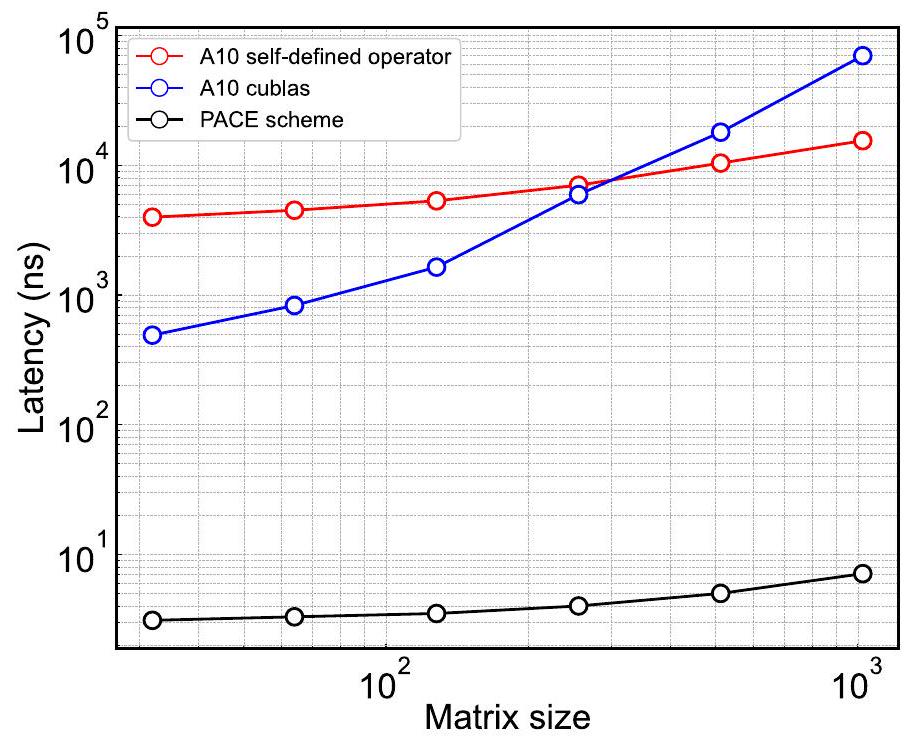 Extended Data Fig. 7 | Latency comparison of the A10 GPU and PACE schemes. The red line shows the latency of self-defined operators, which is optimized on the basis of the listed action items. The blue line is the latency of using NVIDIA’s cuBLAS library. The black line is the estimated latency using the PACE scheme.