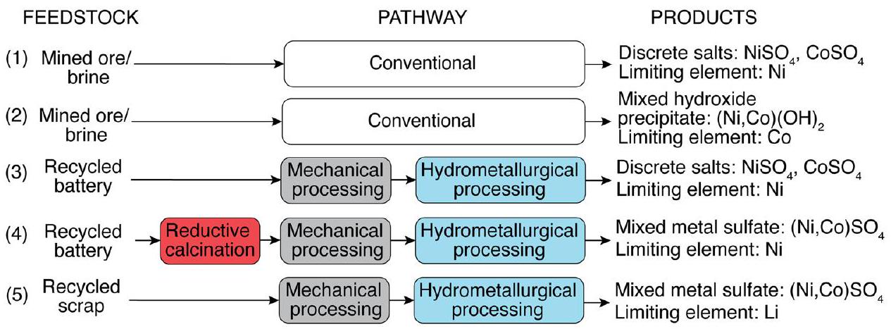 produce identical and , Ni and Co products exist in the form of discrete salts, and ( 1 and 3 ), mixed hydroxide (2), or mixed metal sulfate ( and 5. Red, gray, and blue colors denote reductive calcination pyrometallurgical, mechanical, and hydrometallurgical processes.