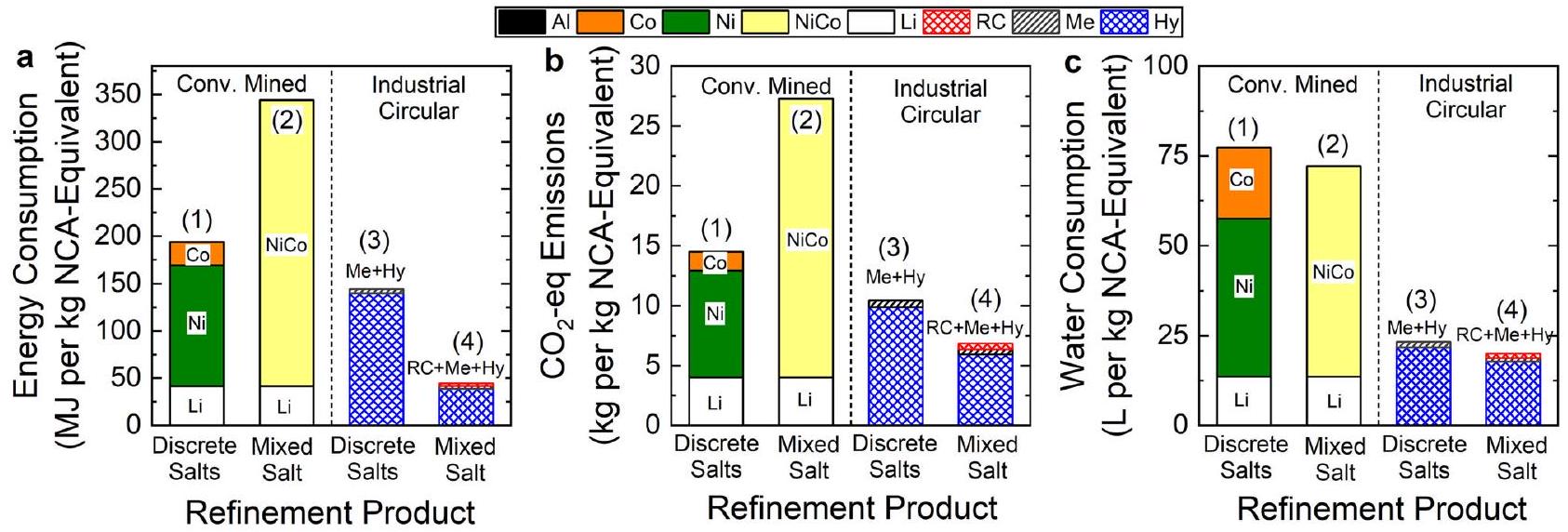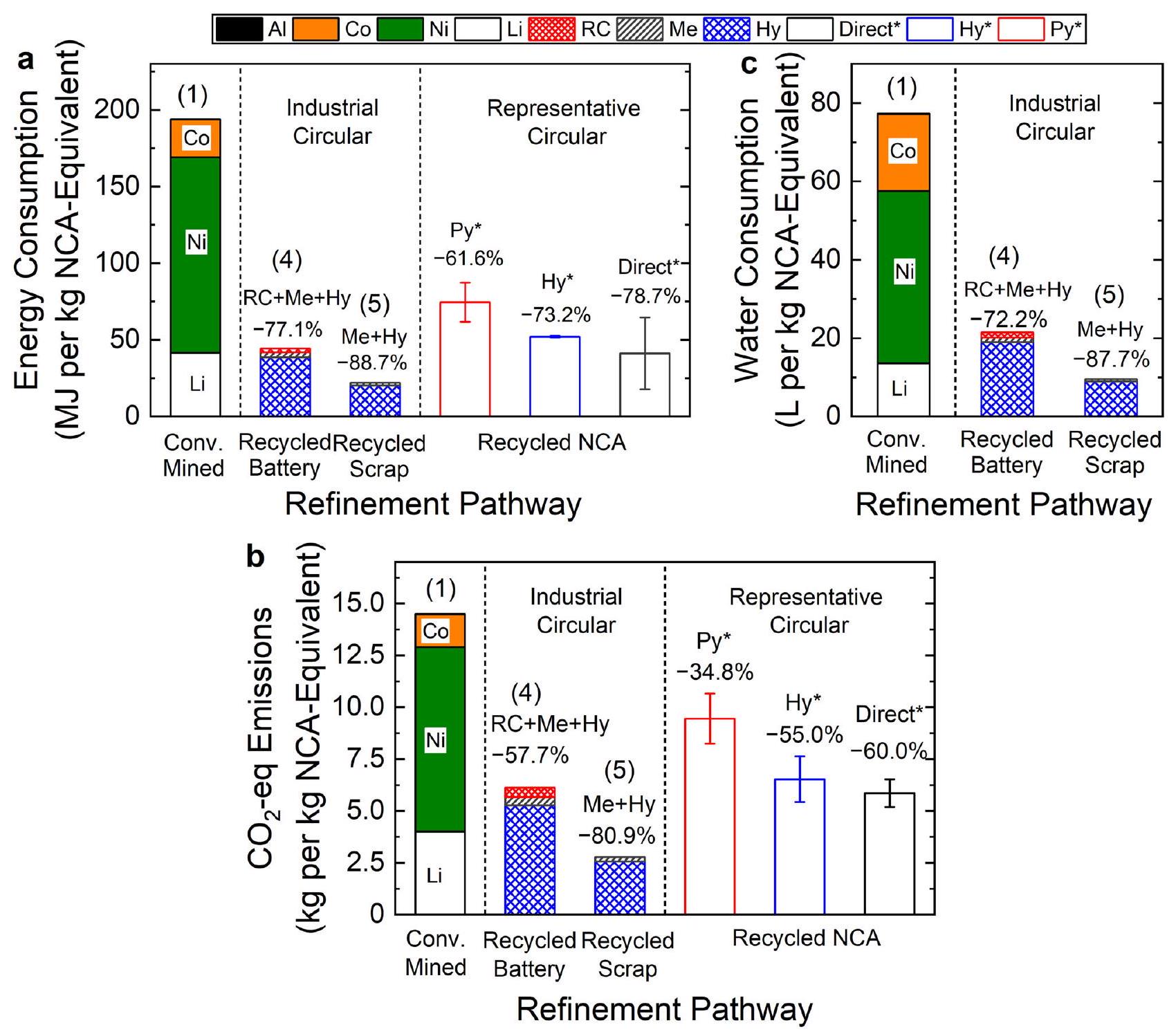 Fig. 3 | Environmental impacts of conventional and circular refining technologies. a Energy consumption, -eq emissions, and water consumption of gate-to-gate refinement by different pathways for lithium nickel cobalt aluminum oxide (NCA) battery-grade salts. Numbers in parentheses labeled on the top of stacked bars denote the refinement methods summarized in Fig. 2. The conventional mined pathway (Conv. Mined) refines natural deposits and produces discrete salts (Method (1) in Fig. 2); note that Al is presented on the top of each stacked bar but its contributions are too small to be seen; specific environmental impacts of each element contributor were detailed in Supplementary Table 3. Circular supply chains refine from either mixed energized end-of-life lithium-ion batteries collected from consumers (Recycled Battery, Method (4) in Fig. 2) or non-energized battery scrap from a production facility (Recycled Scrap, Method (5) in Fig. 2), producing mixed metal sulfates. Multi-step circular refinement pathways include mechanical processing (Me, gray), reductive calcination (RC, red), and hydrometallurgy (Hy, blue). RC is an additional processing step for energized batteries and was not used