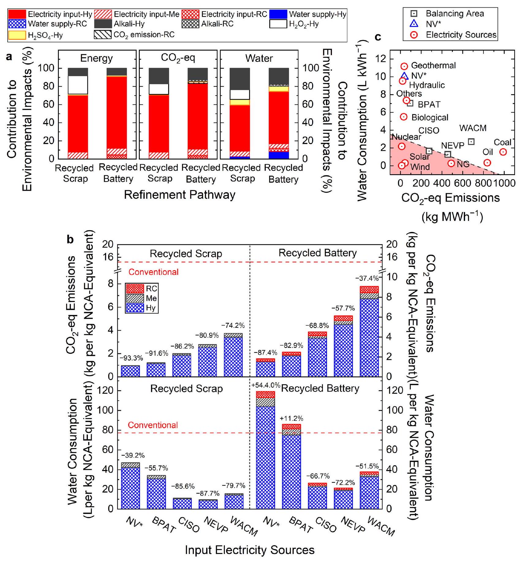 نظرًا لأن الكهرباء هيمنت على التأثيرات البيئية لعمليات إعادة تدوير بطاريات الليثيوم أيون، قمنا بمقارنة عدة مناطق توازن شبكة الكهرباء التي تطلق مجموعة منانبعاثات -eq لكل ميغاوات ساعة (متوسط لعام 2021)في الشكل 5ب (ملوثات الهواء الإضافية المفصلة في الجدول التكميلي 12). استبدال كهرباء NEVP بأخرى مناطق التوازن بما في ذلك إدارة الطاقة في بونفيل (BPAT)، مشغل النظام المستقل في كاليفورنيا (CISO)، إدارة الطاقة الغربية في كولورادو-ميسوري (WACM)، وتعرفة الطاقة المتجددة في نيفادا (NV*)، أسفرت عن تقليص كبير فيانبعاثات تصل إلى (خردة معاد تدويرها) و (البطارية المعاد تدويرها) مقارنة بالتكرير التقليدي (الشكل 5ب). وعلى العكس، يمكن أن يؤدي استخدام شبكات الكهرباء منخفضة الكربون إلى زيادة استهلاك المياه مقارنة بتشغيل NEVP، وفقًا للترتيب NV* BPAT > WACM > CISO > NEVP (الشكل 5ب). تجدر الإشارة إلى أن عمليات التكرير الدائرية المعتمدة على NV* و BPAT تجاوزت مستوى استهلاك المياه للتكرير التقليدي بسبب المساهمات الكبيرة من الطاقة المائية والحرارية الجوفية. كشفت المزيد من التحقيقات في مصادر الكهرباء الشبكية لمناطق التوازن عن وجود تبادل بينانبعاثات -eq واستهلاك المياه بناءً على نوع توليد الكهرباء (الشكل 5c)؛ معظم مصادر الكهرباء ذات الانبعاثات المنخفضة نسبيًاأظهرت انبعاثات -eq (مثل تلك المستندة إلى الطاقة الحيوية أو المائية أو الحرارية الجوفية) استهلاكًا عاليًا للمياه، والعكس صحيح. كما أن هذا التبادل يفسر التأثيرات المختلفة لمصادر الكهرباء على التأثيرات البيئية لخطوة تنقية مواد ريدوود ومسارات أخرى (المفصلة في الشكل التوضيحي 2d). ومع ذلك، ستؤثر مصادر الكهرباء لكل منطقة توازن على كلا-انبعاثات غازات الدفيئة واستهلاك المياه. على سبيل المثال، لأن الكهرباء المستندة إلى NEVP تشمل نسبة كبيرة نسبيًا ( ) من غاز طبيعي كثيف الانبعاثات مع استهلاك منخفض للمياه، التحول إلى مصادر كثيفة المياهستقل الكهرباء BPATانبعاثات -eq مع زيادة استهلاك المياه.