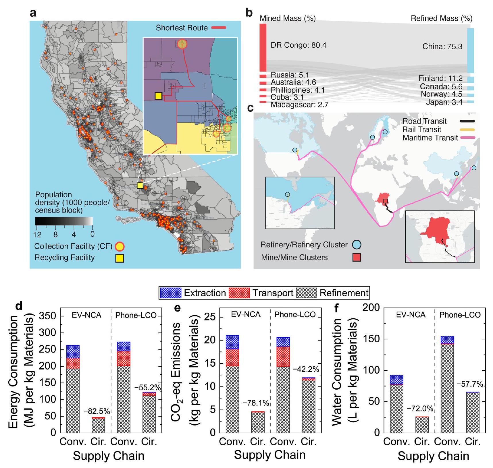 قبل خطوة التكرير، تمر بطاريات الليثيوم أيون بخطوات سابقة تتعلق باستخراج المواد ونقلها إلى مرافق التكرير (الشكل 1ب). تم تحليل الأثر البيئي لهذه الخطوات السابقة لاثنين من كيميائيات بطاريات الليثيوم أيون التمثيلية وحالات استخدام البطارية: NCA في حزم بطاريات السيارات الكهربائية، وأكسيد الكوبالت الليثيوم.أو LCO) في الهواتف الذكية. تم اختيار كاليفورنيا لتقييم الاستخراج الدائري لأنها تمتلك أكبر عدد من السكان وأكبر حصة في سوق السيارات الكهربائية في الولايات المتحدة الأمريكية.تم اعتبار الهواتف الذكية مستخرجة عند جمعها وتجميعها ونقلها من جميع سكان كاليفورنيا (تم تحليلها حسب كتلة التعداد) إلى أقرب منشأة جمع موجودة.تم تحديد أقصر مسار لجمع البيانات من خلال تقليل المسافات من مجموعة الكتل إلى مركز التجميع (الشكل 6أ؛ تم تلخيص النموذج في قسم “الطرق” وتفصيله في الملاحظة التكميلية 4)لتحديد الأثر البيئي لاستخراج المواد التقليدية من التعدين، تم تعديل بيانات سلسلة الإمداد العالمية من GREET. (الشكل التكميلي 4، الجداول التكمالية 14، 15). استخراج الهواتف الذكية في سلسلة التوريد الدائرية أصدر فقط -معادل لكل كجم LCO-eq، أقل بكثير من التعدين التقليدي ( -معادل لكل كجم LCO-eq) بمقدار . كان استهلاك الطاقة والمياه أقل بشكل مشابه في سلسلة التوريد الدائرية (الجدول التكميلي 15).