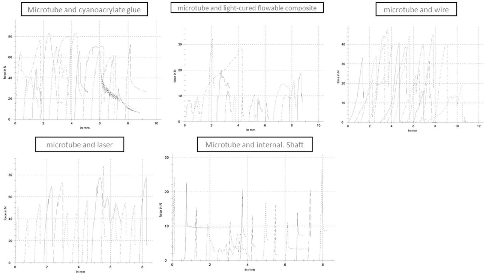 The Nd:YAG laser has been suggested for welding SS and Ni-Ti alloys to establish a fixed connection [34]. This type of laser, equipped with a small diameter optic fiber, is utilized in endodontics for both disinfection [35] and retreatment purposes, such as softening gutta-percha, removal of sealers [36], and either bypassing or retrieving broken instruments [22, 37].In the current study, the average pull-out force in the microtube and laser method was about 60 N , which was significantly higher than the methods of microtube and wire, microtube and light-cured flowable composite, and microtube and internal shaft. Our results were contrary to Hagiwara’s findings [22]. This discrepancy may be attributed to different factors, including the type of laser, laser device settings (power, frequency, pulse), type of fragment (SS vs. NiTi/ hand file vs. rotary file), and the diameter of the tube