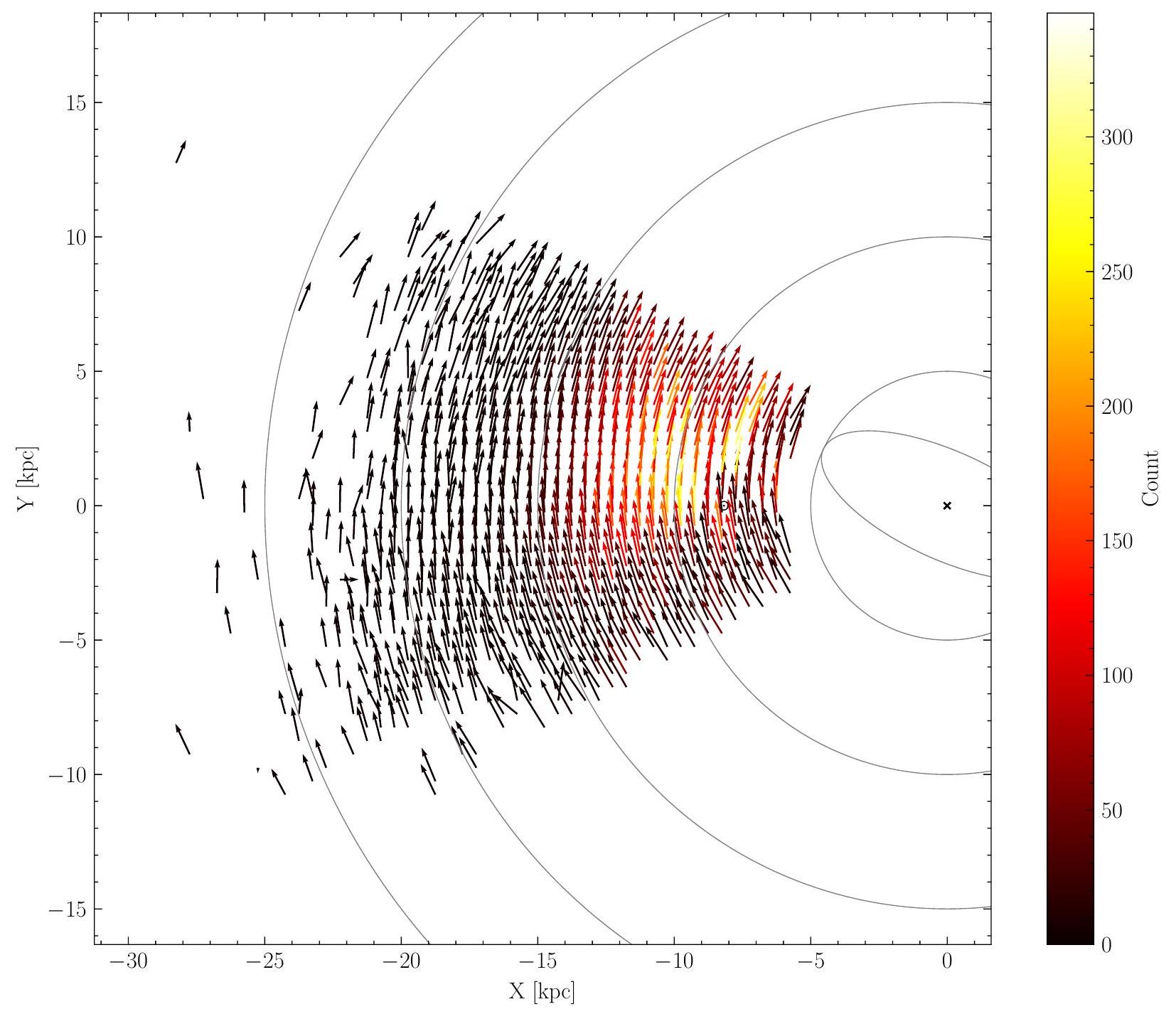 الشكل 2. خريطة XY المركزية للمجرة لـ 33,335 نجمة تم استخدامها لحساب السرعات الدائرية، مرسومة في حاويات 0.5 كيلو فرسخ ضوئي. تمثل المتجهات متوسط سرعة النجوم داخل كل حاوية، مشفرة بالألوان حسب عدد النجوم في كل حاوية.