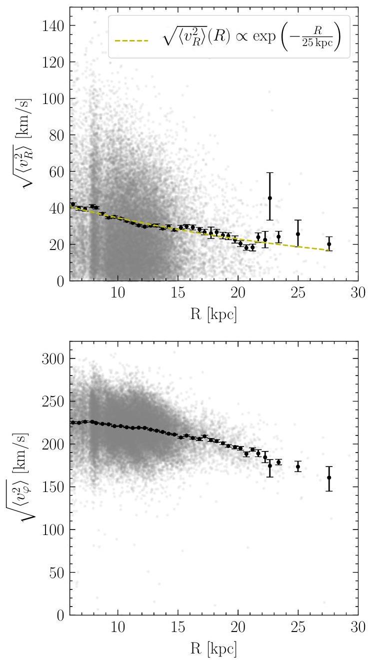 الشكل 3. الملفات الشعاعية لمكونات المعادلة (الأعلى) و (أسفل)). تمثل النقاط الرمادية في الخلفية نجومًا فردية. النقاط السوداء هي المتوسطات الجماعية للنجوم في نفس الصناديق المستخدمة في حساب السرعات الدائرية، مع تقدير الشكوك عبر تقنية البوتستراب باستخدام 100 عينة. الاعتماد الملائم لـيظهر مع المنحنى المتقطع الأصفر في اللوحة العلوية.
