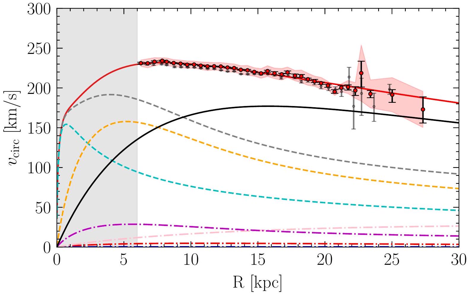 عند ، تتفق نتيجتنا مع Eilers et al. (2019) ضمن ، لكنها أكثر سلاسة وتمتد إلى أكبر مع عدم يقين أقل. والأهم من ذلك، أننا نرى بوضوح أكثر انخفاضًا ثابتًا وسريعًا في المنحنى عند أنصاف أقطار المجرة الخارجية (). لاحظ أن الانخفاض من غير المحتمل أن يكون نتيجة ملوثات من هالة النجوم (انظر الملحق A).