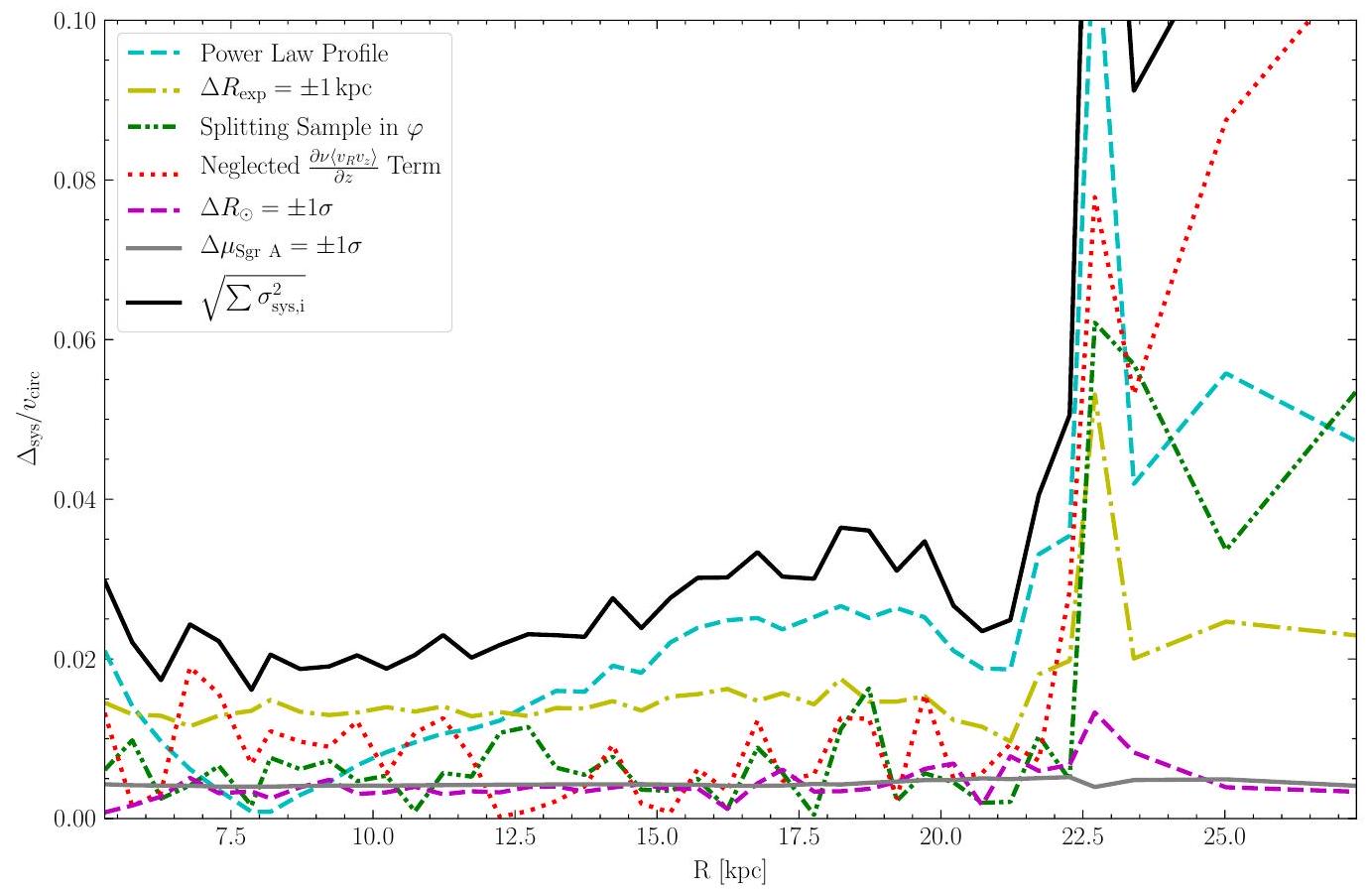 Figure 5. Summary of systematic uncertainties in the circular velocity curve. The systematic uncertainties from assuming a power law with an index of -2.7 instead of an exponential function for the radial density profile of the tracer population (cyan dashed line), from varying the scale length in the exponential radial density profile (yellow dashed-dotted line), and from splitting the sample into two distinct wedges (green dashed-double-dotted line) are moderate between to . Similarly, we see very moderate uncertainties from the assumed solar distance from the galactic centre (magenta dashed line) and the proper motion of Sgr A* (grey solid line) at level. The uncertainty from the neglected term in Equation 4 (red dotted line) is very moderate ( ) up to but increases and dominates at larger radii. The total systematic uncertainty (black solid line) ranges between to up to , increasing to due to the large asymmetric drift correction as described in Section 4.