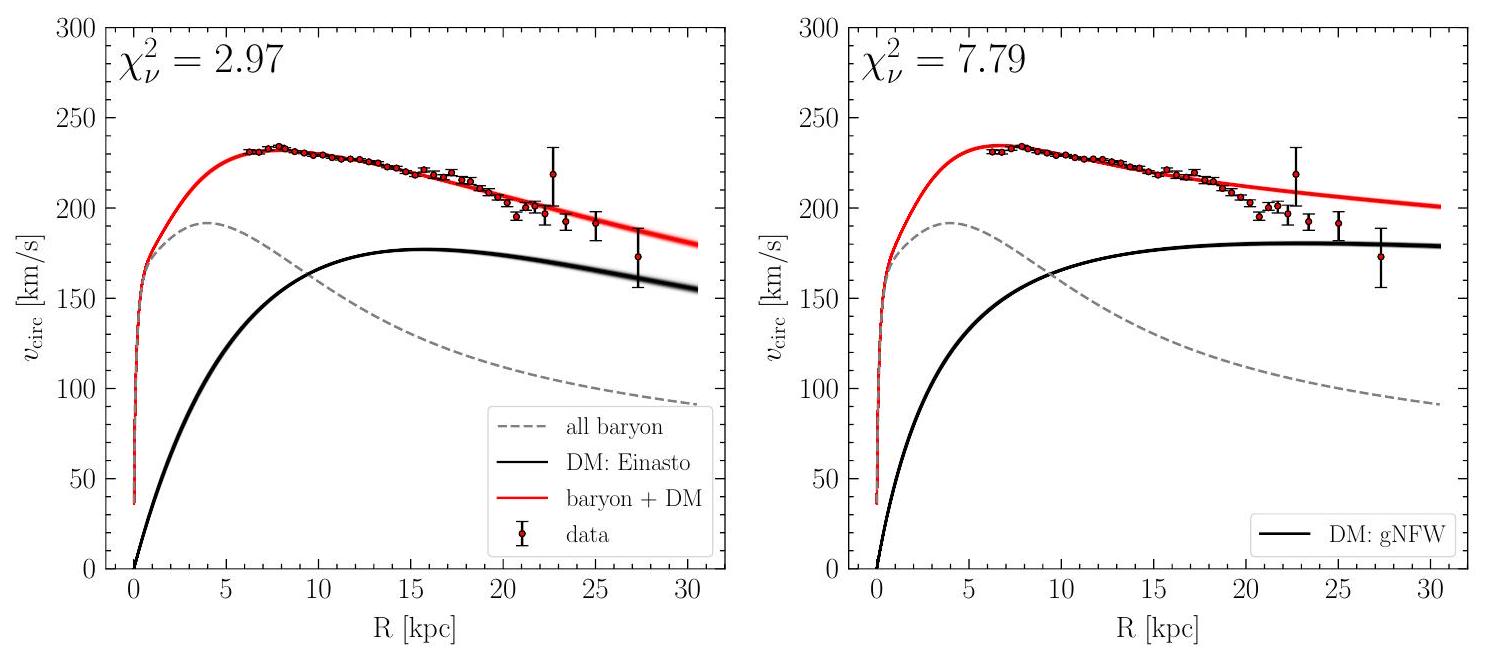 We discuss the differences in the DM profile fitting result and its implication in this section. In particular, we focus on the different virial masses predicted by the two profiles. For the gNFW profile fit, we find the virial mass at for the Milky Way DM halo at . For the Einasto profile fit, we find the virial mass at for the Milky Way DM halo at . Such drastic differences in virial mass estimates between the Einasto profile and the NFW/gNFW profile model have been studied in previous papers (de Salas et al. 2019; Jiao et al. 2021). de Salas et al. (2019) compared the results between a gNFW and Einasto profile fit using the same baryonic model (model B2 in the original study) of this study. They find that the Einasto profile consistently results in a lower virial mass estimate, with the gNFW profile giving and the Einasto profile giving . Our estimates, despite the poor fit in the gNFW case, are consistent with de Salas et al. (2019). Similarly, Jiao et al. (2021) attempted to better account for the decline in the circular velocity curve found in Eilers et al. (2019) measurements. They found that the Milky Way virial mass could be as low as with an Einasto profile fit, where the fit is mostly constrained by the last few data points from Eilers et al. (2019). They concluded, however, that a higher virial mass up to still could not be excluded when allowing the fit to be a little worse by forcing the gNFW profile. We see the same trend of the gNFW profile giving a systematically higher mass estimate than the Einasto profile. The data, especially at outer galactic radii , strongly prefer the Einasto profile. Sylos Labini et al. (2023) combined the circular velocity curves from Eilers et al. (2019) and Wang et al. (2022) to study three DM models: an NFW halo model, a DM disc (DMD) model, and a model based on the Modified Newton Dynamics (MOND) theory. They find a similarly low virial mass with the NFW profile fit at , consistent with our gNFW result. The DMD model, on the other hand, predicts an even lower DM mass at .