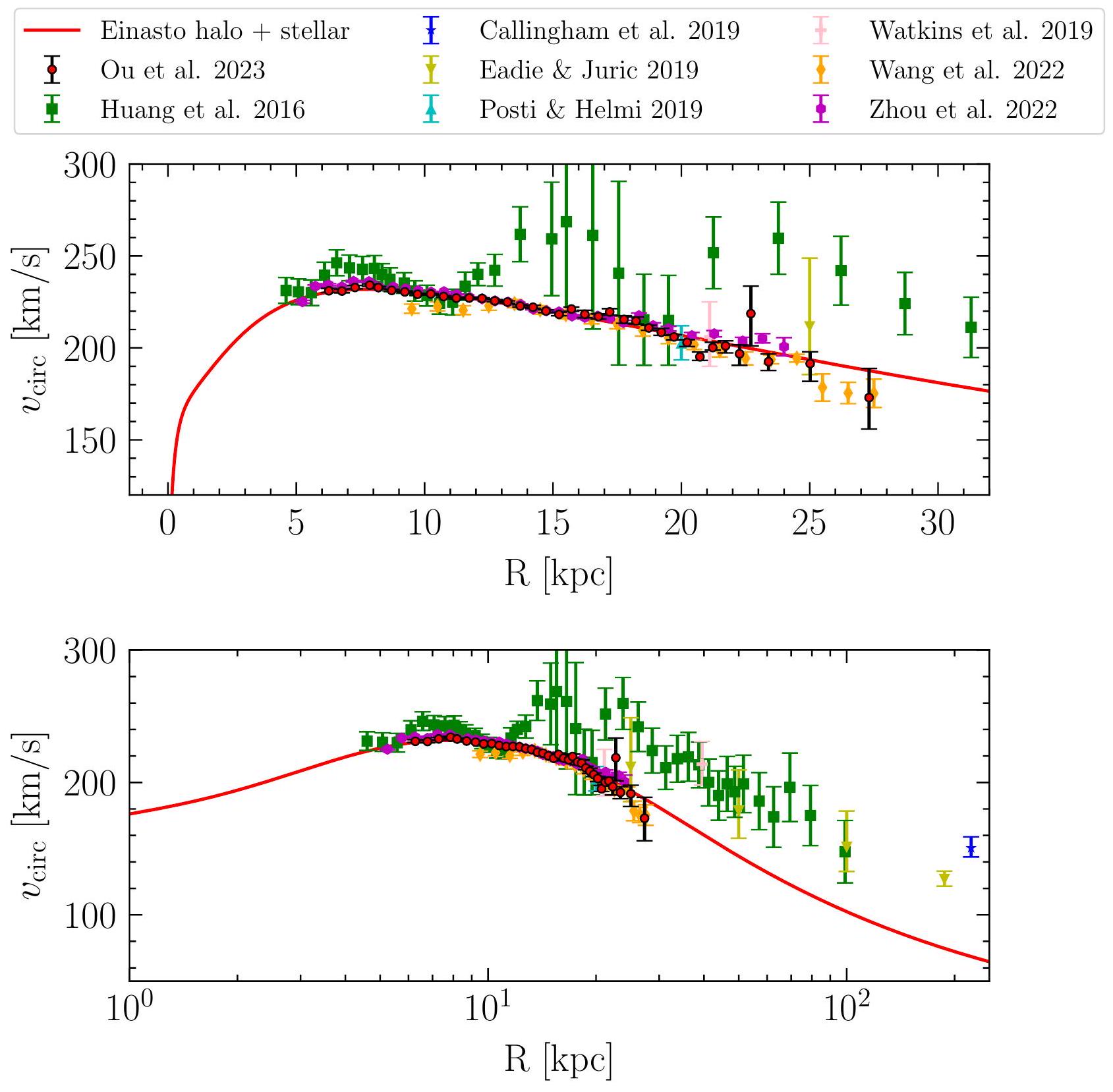 Figure 8. Best-fit model circular velocity curve (red curve) using the Einasto profile with circular velocity measurements from this study and previous literature values. The top(bottom) panel shows data for ranging from to . Values are taken directly from the corresponding literature for Huang et al. (2016) and Wang et al. (2022). For the virial/enclosed masses reported in Callingham et al. (2019), Eadie & Jurić (2019) ,Posti & Helmi (2019), Watkins et al. (2019), the circular velocities are calculated at virial/given radii.
