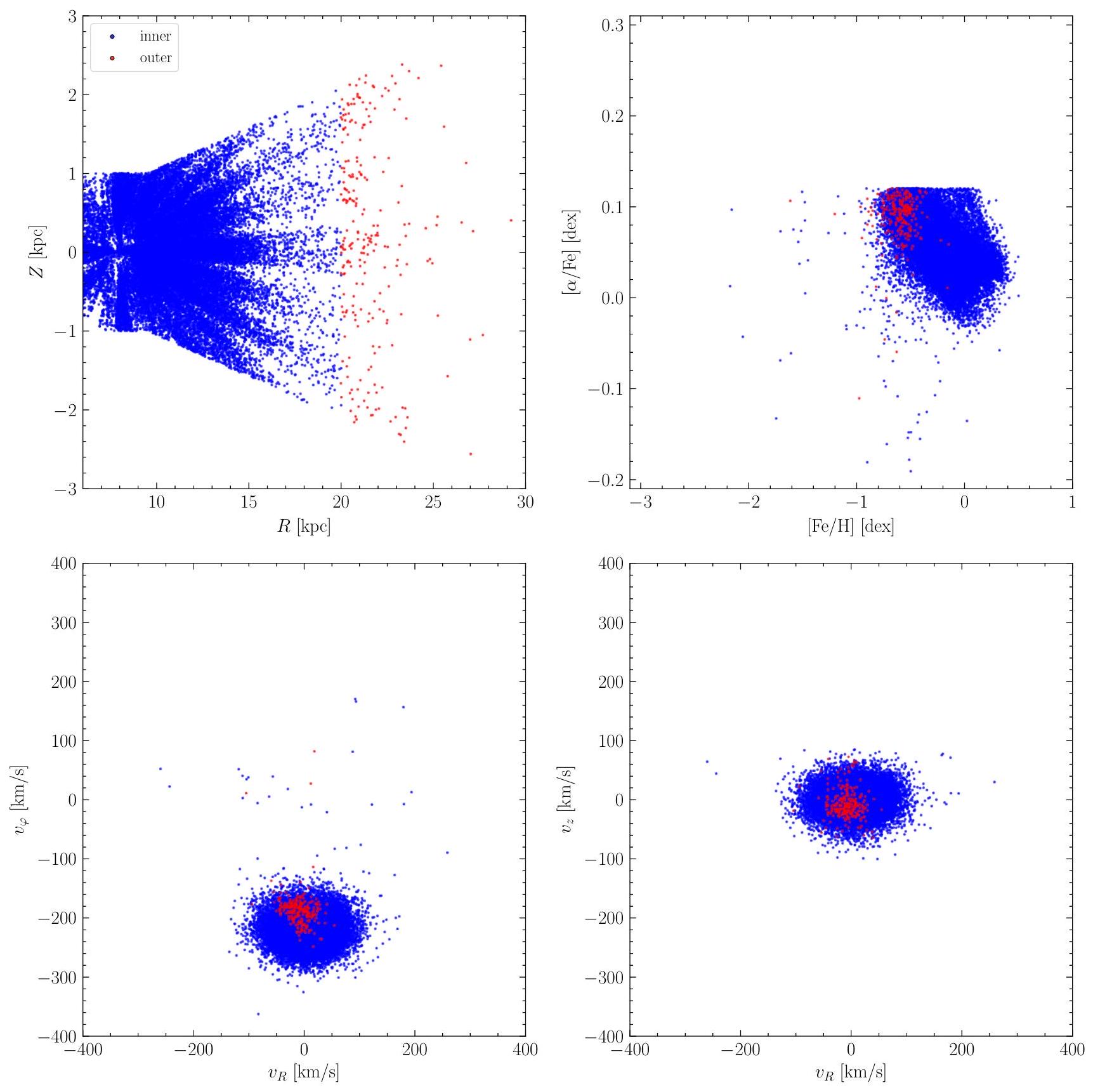 Figure A1. Comparison between stars with (blue) and stars with (red). The top-left panel shows the stars in cylindrical galactocentric coordinates. The top-right panel includes the -element abundances ( ) as a function of metallicity ( ) with value taken from APOGEE. The bottom two panels are the cylindrical velocities of the two samples.