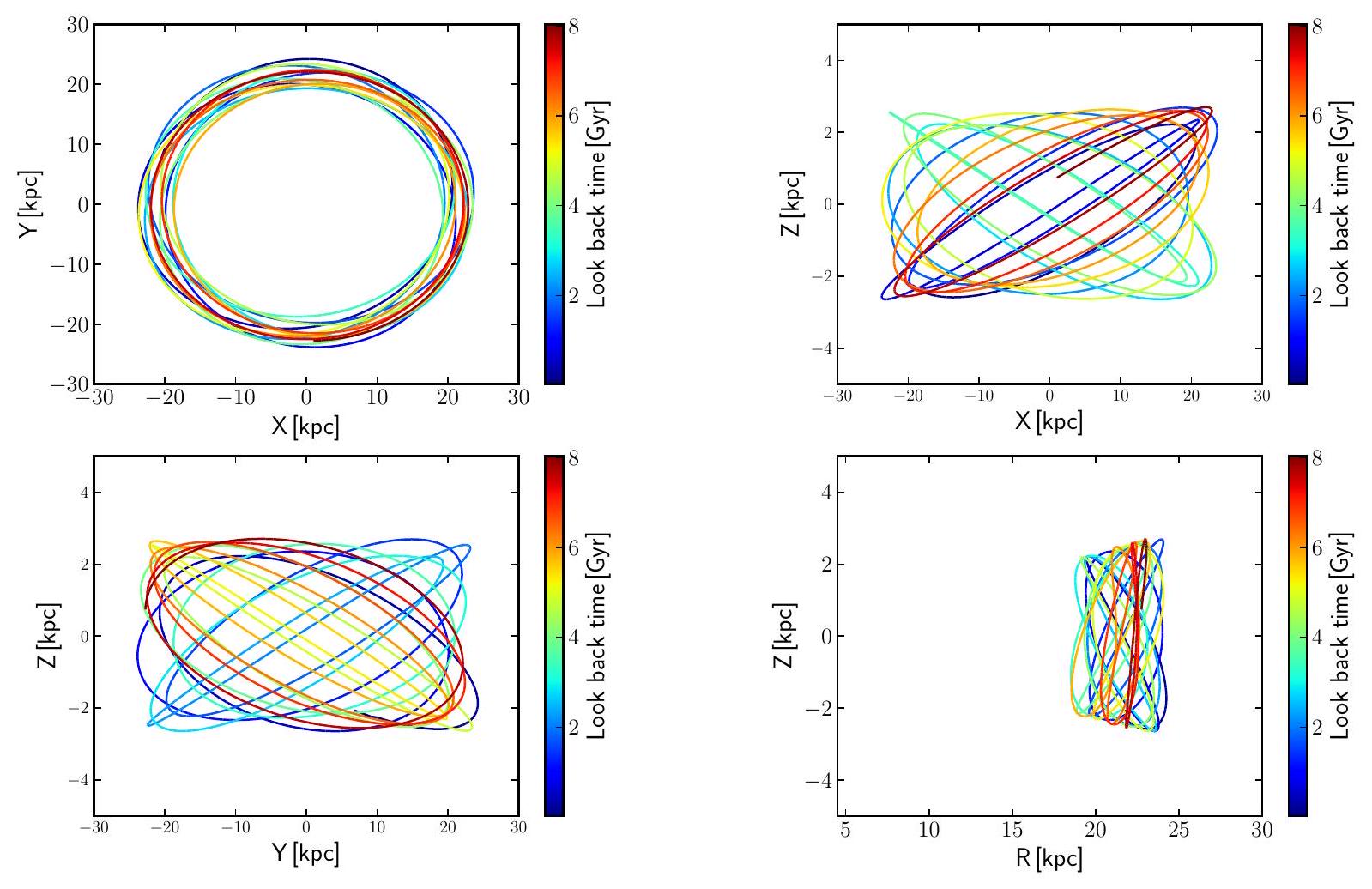 Figure A2. Projections of an outer disc star, Gaia DR3 244707655774974464, with a disc-like orbit in the X-Y (top-left), X-Z (top-right), Y-Z (bottom-left), and R-Z (bottom-right) planes. The orbit is color-coded by the look back time. The majority of the outer sample exhibits these very similar orbits.