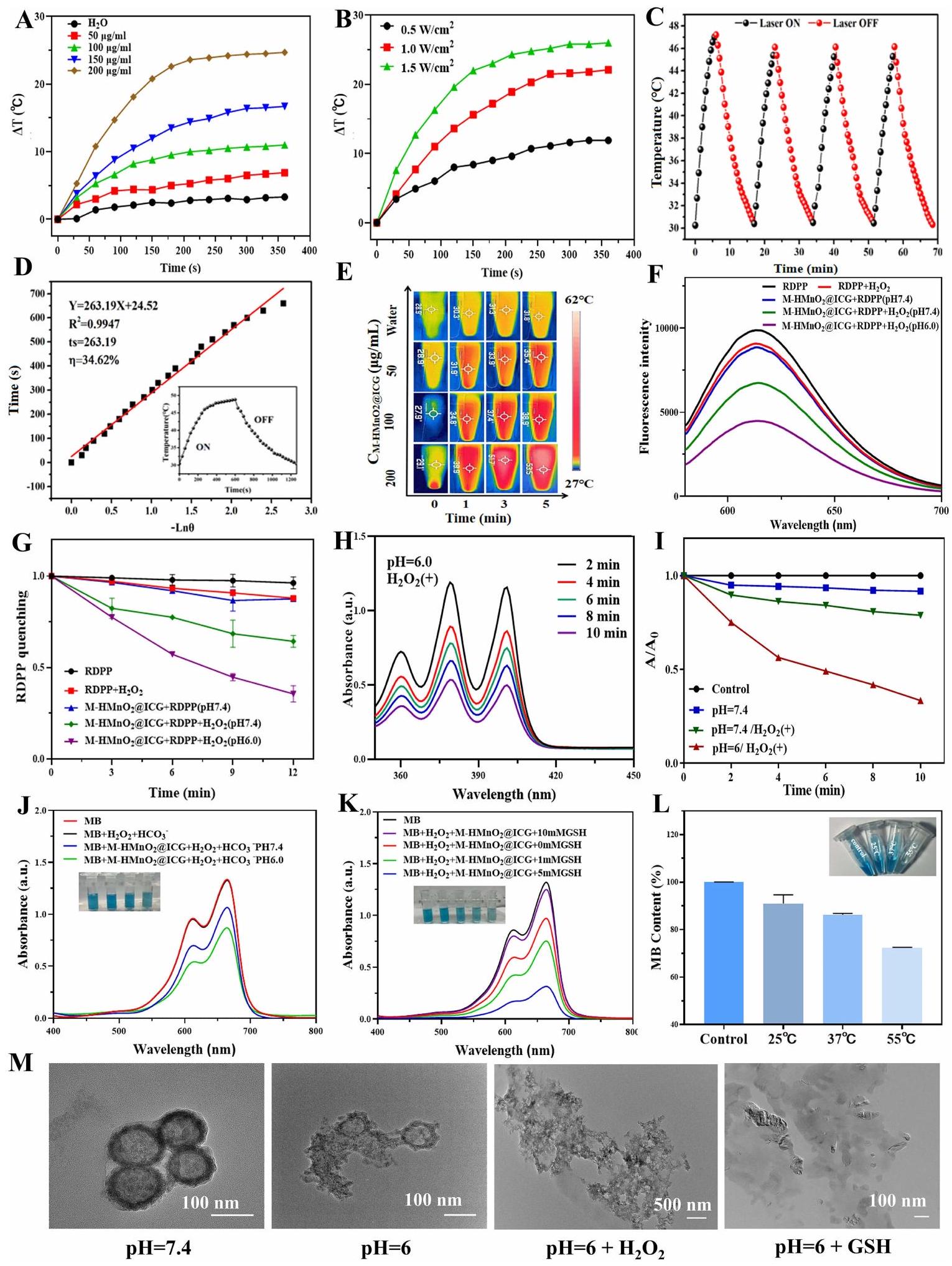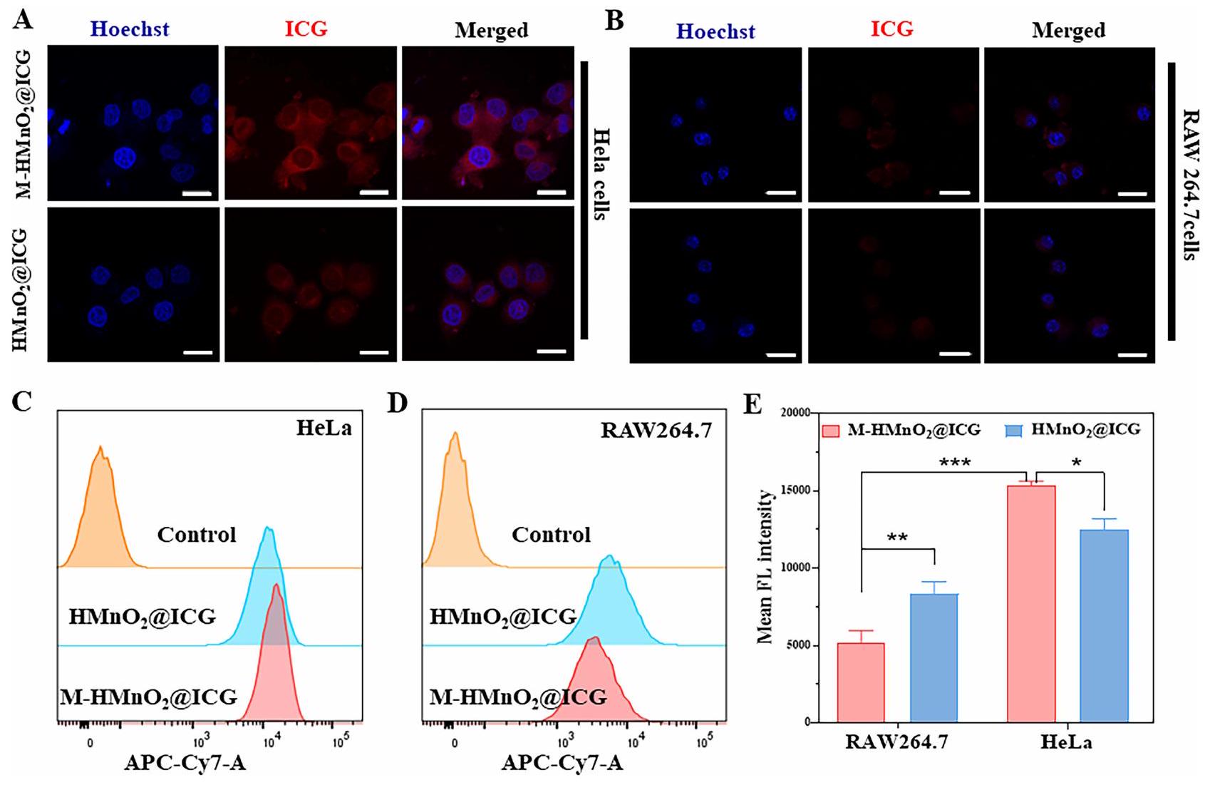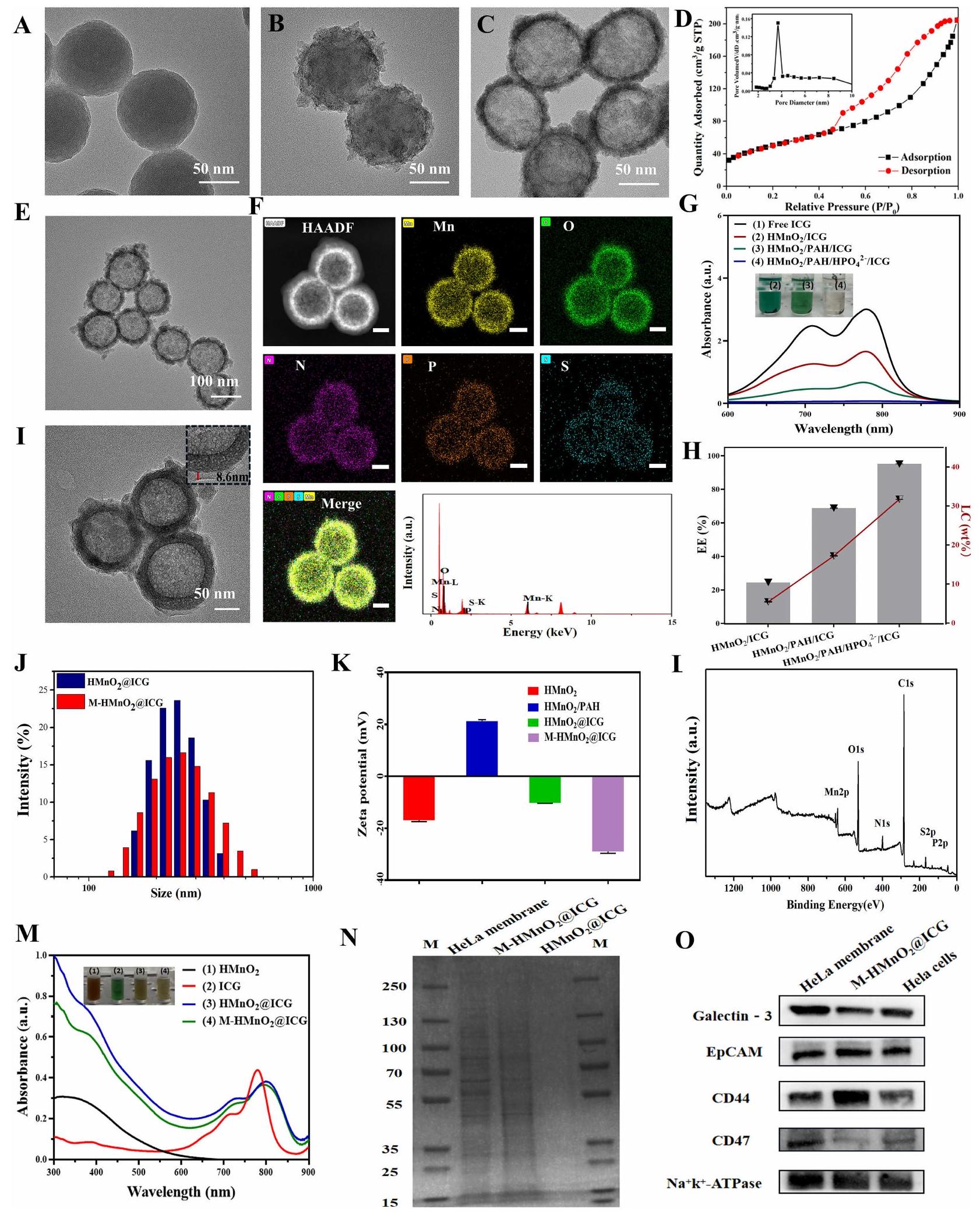 الطرق: في هذه الدراسة، تم استخدام ثاني أكسيد المنغنيز المسامي المجوف كحامل لبناء جزيئات نانوية مشحونة إيجابياً معدلة بواسطة بولي (هيدروكلوريد الأليل أمين). تم تحميل NP بكفاءة مع المحسس الضوئي إندوسيانين الأخضر (ICG) من خلال إضافة أيونات هيدروجين فوسفات لإنتاج تأثير تجميع الأيونات المضادة. تم تنفيذ تغليف غشاء خلايا هيلا لتحقيق M-HMnO النهائية @ICG NP. في هذه البنية،