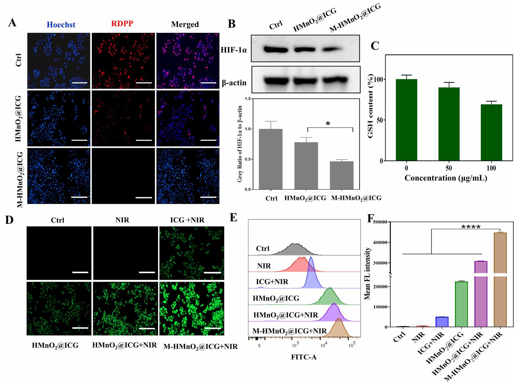 To further validate the synergistic strategy for PDT enhancement, we examined in-vivo hypoxia levels via immunofluorescence staining of mouse tumor tissue sections for HIF-1