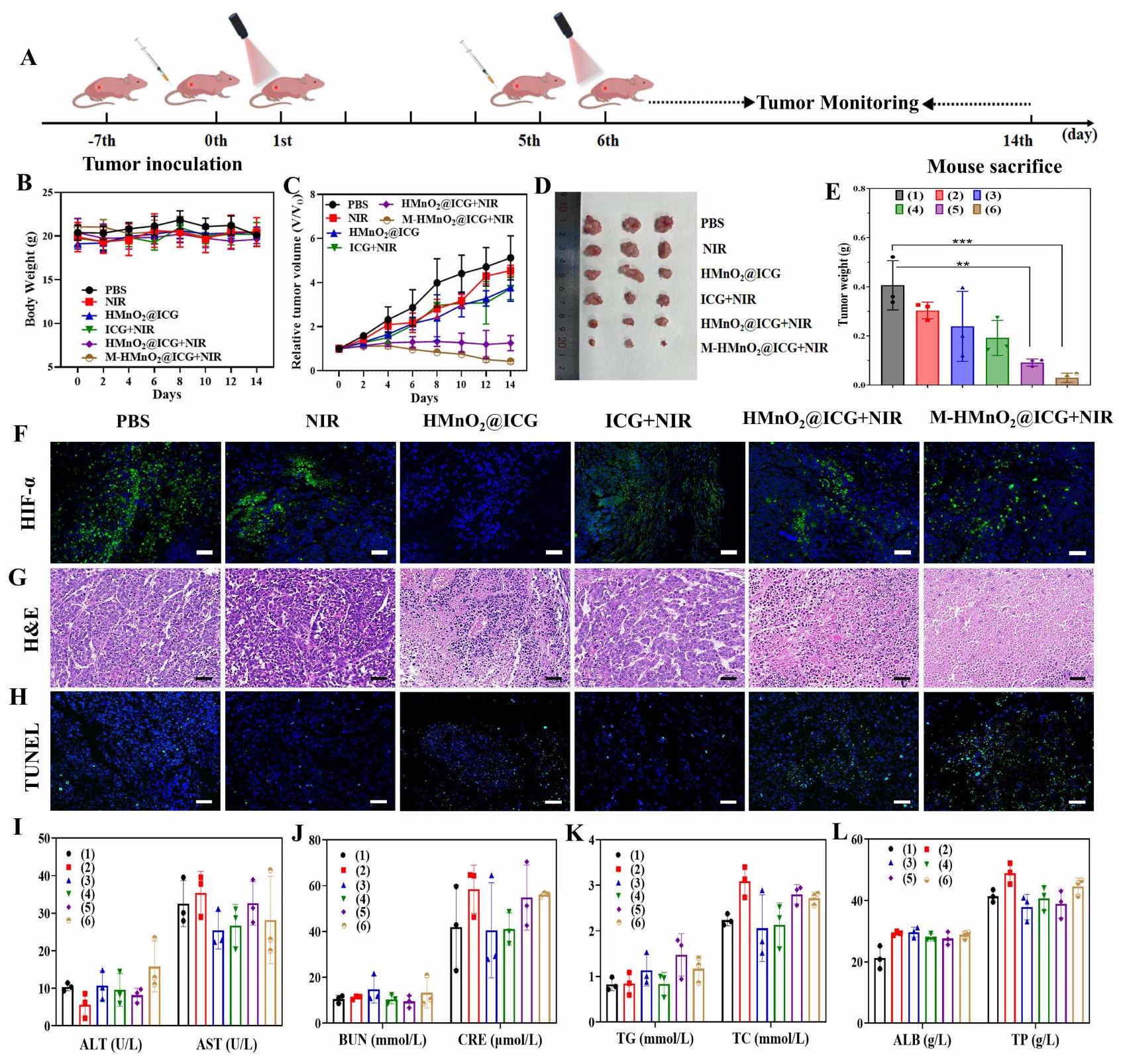 @ICG + NIR, and M-HMnO2 @ICG + NIR). The treatments were administered by tail vein injection on days 0 and 5 , and 3 min laser irradiation of the tumor regions was performed at 24 h after injection (Figure 7A). The body weights of the mice and the tumor volumes were monitored at 2 -day intervals for 14 days after the first injection. The body weights of the mice did not change significantly over time in any group, indicating that no treatment had an acute toxic effect (Figure 7B). The tumor volumes increased rapidly over the 14 days in the control and NIR groups (Figure 7C), indicating that cervical cancer is extremely proliferative and that laser irradiation alone has no therapeutic