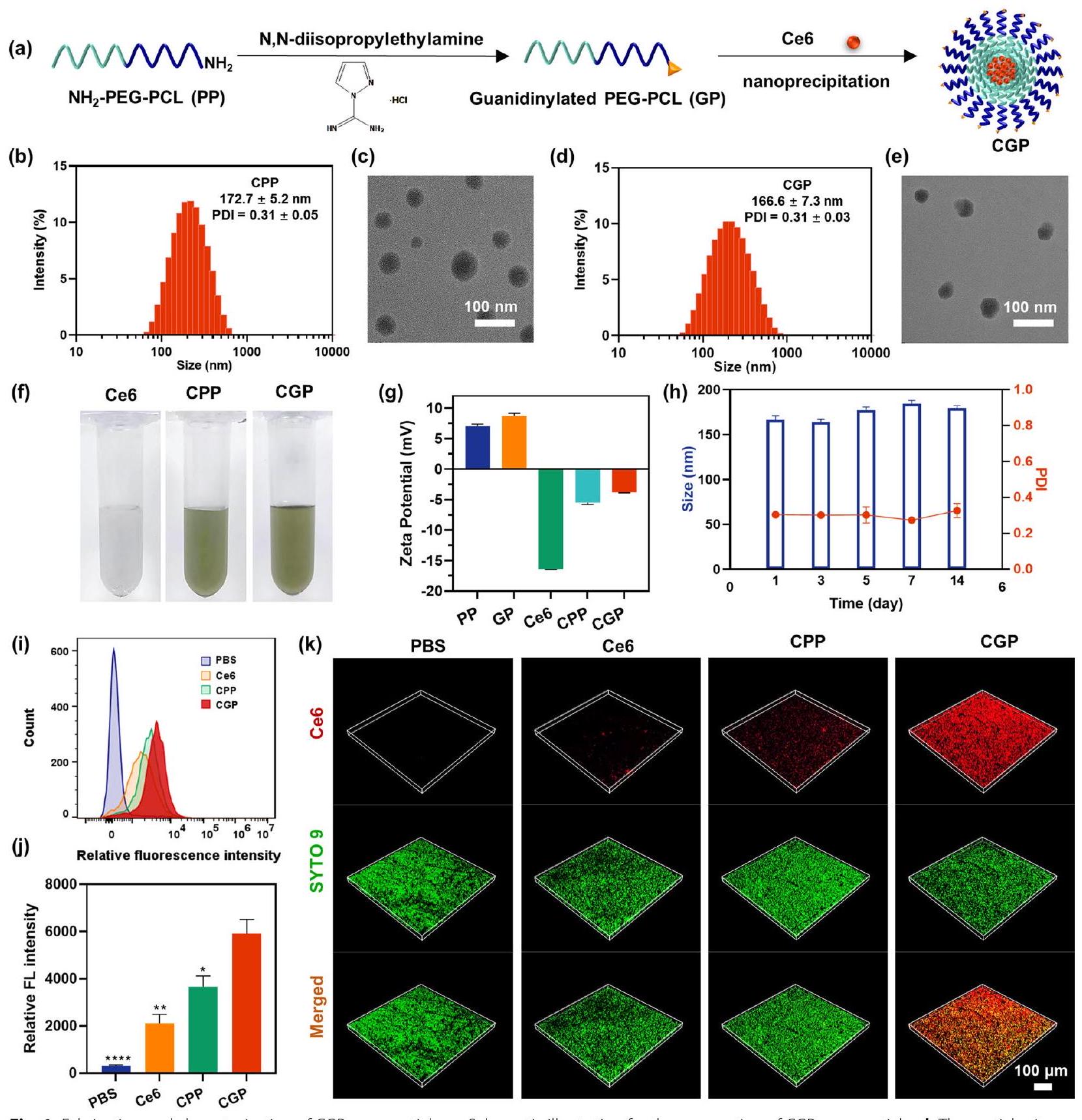 تتأثر فعالية العوامل المضادة للميكروبات بشكل كبير بقدرتها على اختراق الأغشية الحيوية، والتي تُعرف بأنها تعيق الفعالية العلاجية لمثل هذه العوامل. تم تقييم نفاذية الأغشية الحيوية لـ CGP باستخدام المجهر الضوئي الماسح بالليزر، مع استخدام SYTO-9 كمؤشر لتلوين الأغشية الحيوية. بعد 5 دقائق من التعايش المشترك مع أغشية E. faecalis الحيوية، أظهر تحليل المجهر الضوئي الماسح بالليزر توهجًا أحمر خافتًا ينبعث من Ce 6 داخل الأغشية الحيوية المعالجة بـ Ce 6 الحر، مما يشير إلى اختراق محدود.