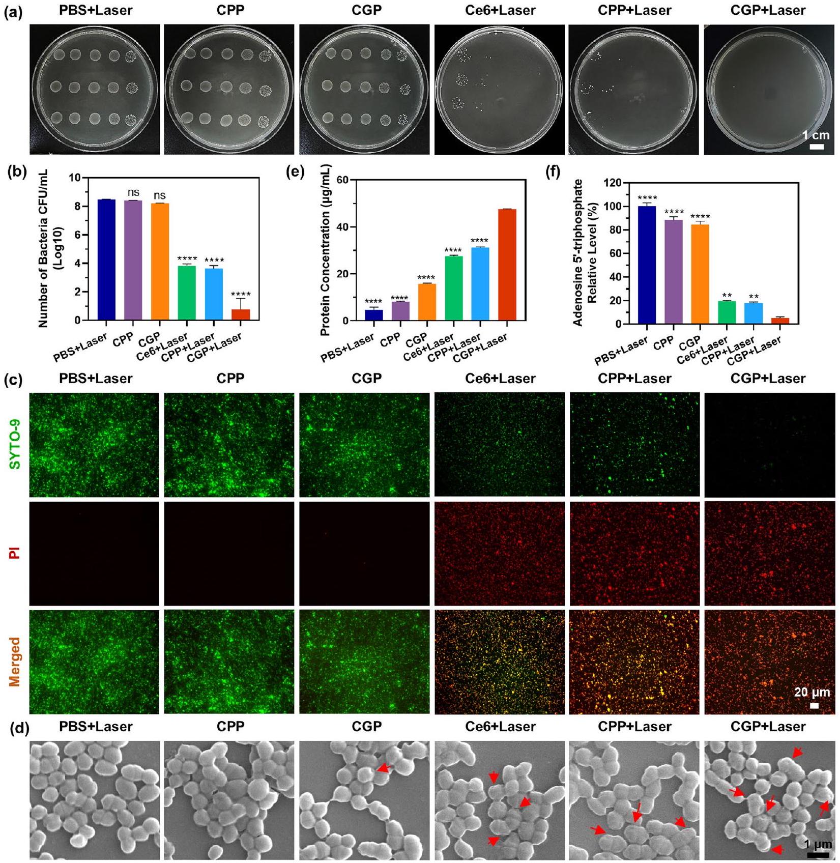 لتجف بشكل طبيعي. أخيرًا، تم رش البكتيريا بالذهب وتمت ملاحظتها باستخدام مجهر إلكتروني ماسح (SU8010، HITACHI). تضمنت مجموعات التحكم لهذه التجارب PBS + ليزر، CPP، CGP، Ce6 + ليزر، و CPP+ليزر.