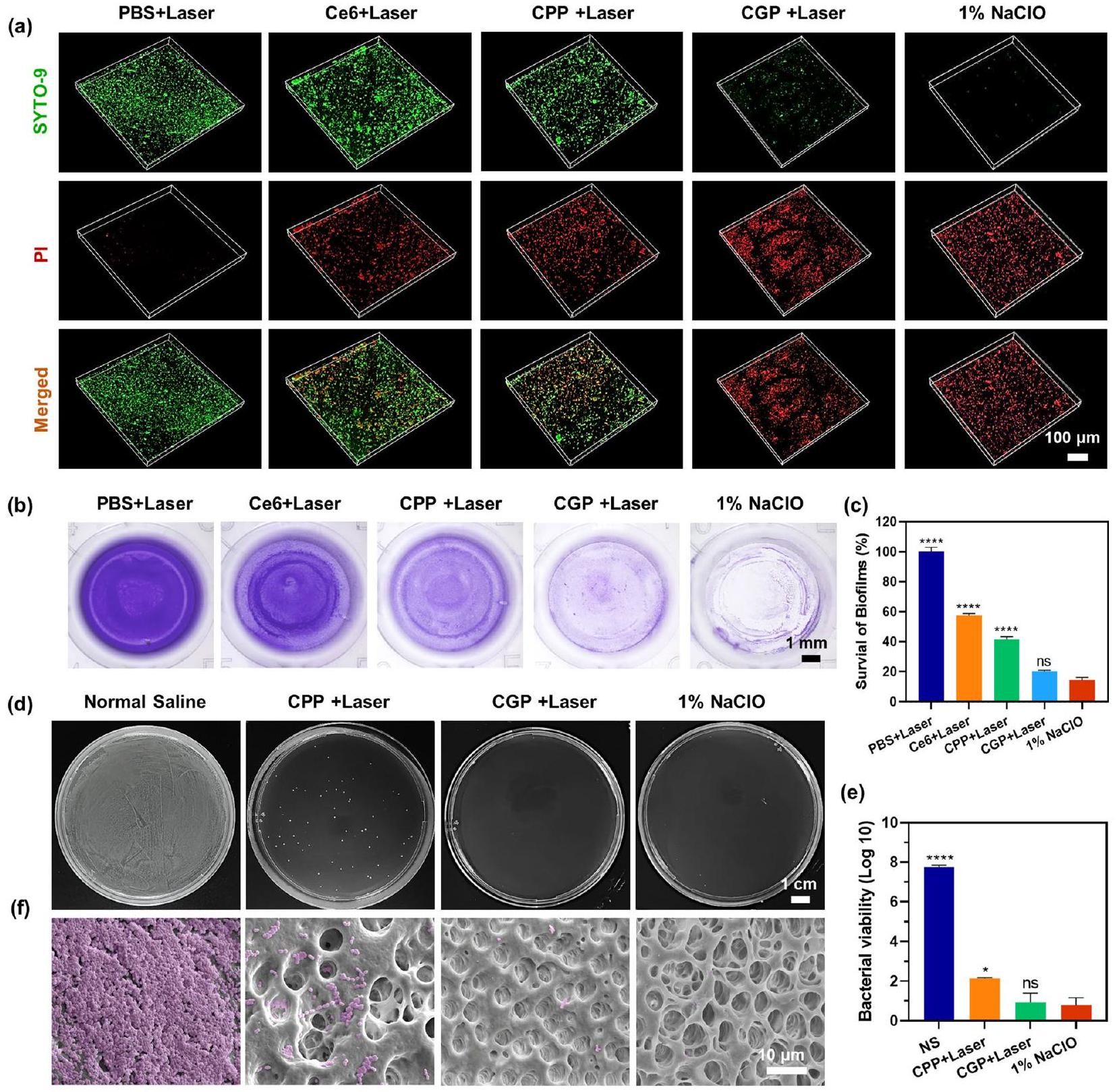تشجيعًا من النتائج الإيجابية لتقنية CGP + الليزر في صبغ البكتيريا الحية/الميتة وصبغ الكريستال البنفسجي، قمنا بزراعة أغشية حيوية لبكتيريا E. faecalis في قنوات الجذور لأسنان بشرية مستخرجة لتقييم فعالية القضاء على الأغشية الحيوية. كما هو موضح في الشكل 4d و e، تم ملاحظة حيوية البكتيريا بعد علاج CPP + الليزر عند