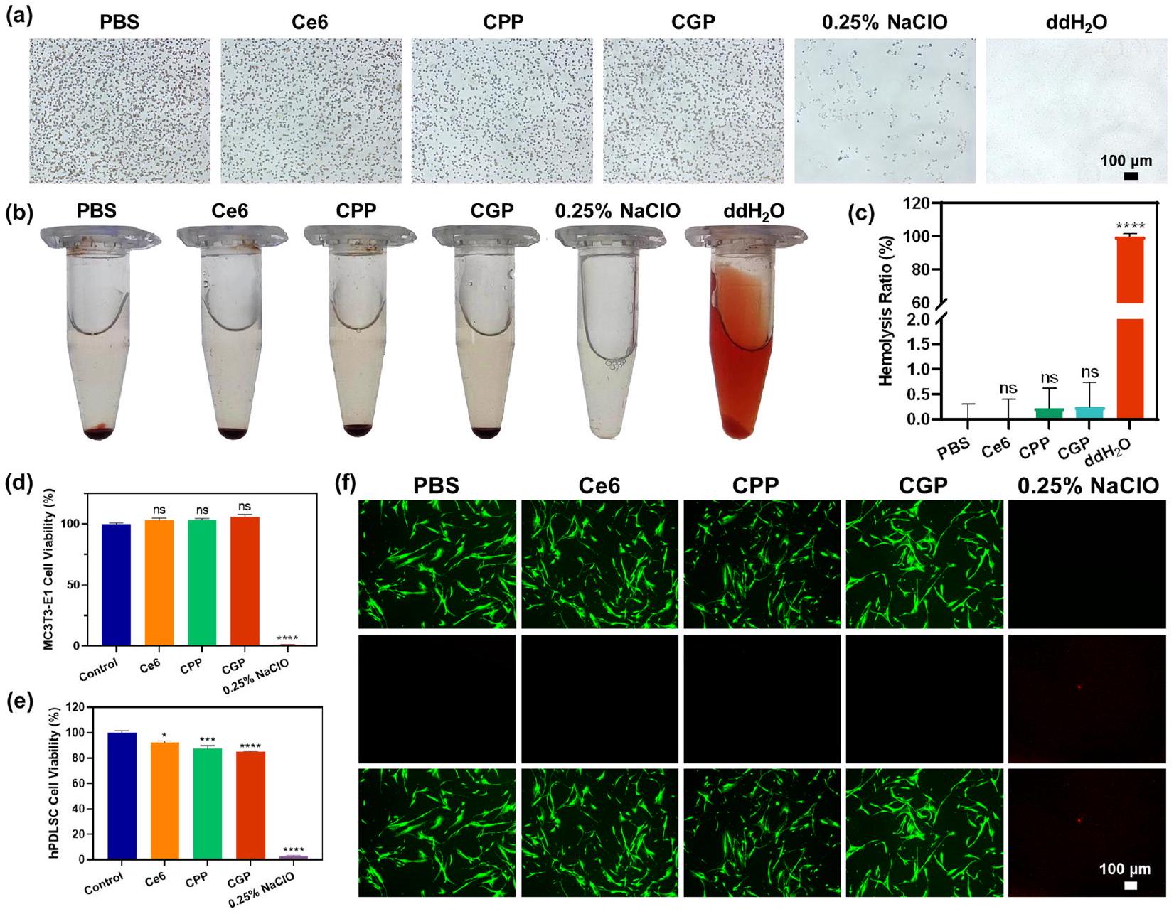 significant red fluorescence from PI staining observed (Fig. 5f). As predicted, NaClO exhibited pronounced cytotoxicity, with less than