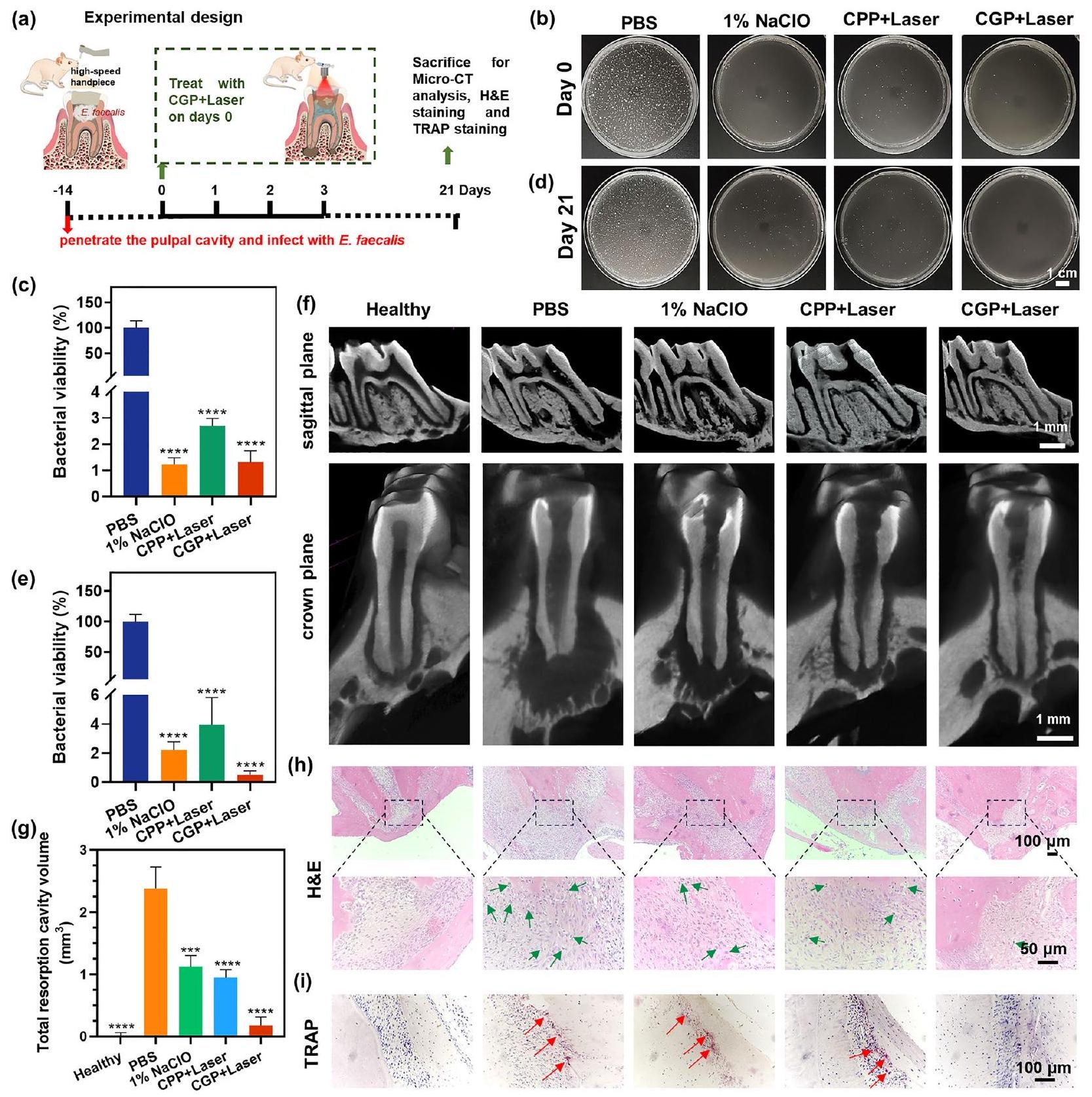 Encouraged by the favorable outcomes of CGP + Laser in live/dead bacterial staining and crystal violet staining, we proceeded to cultivate E. faecalis biofilms in the root canals of extracted human teeth to assess the biofilm eradication efficacy. As shown in Fig. 4d and e, the bacterial viability post CPP + Laser treatment was observed at