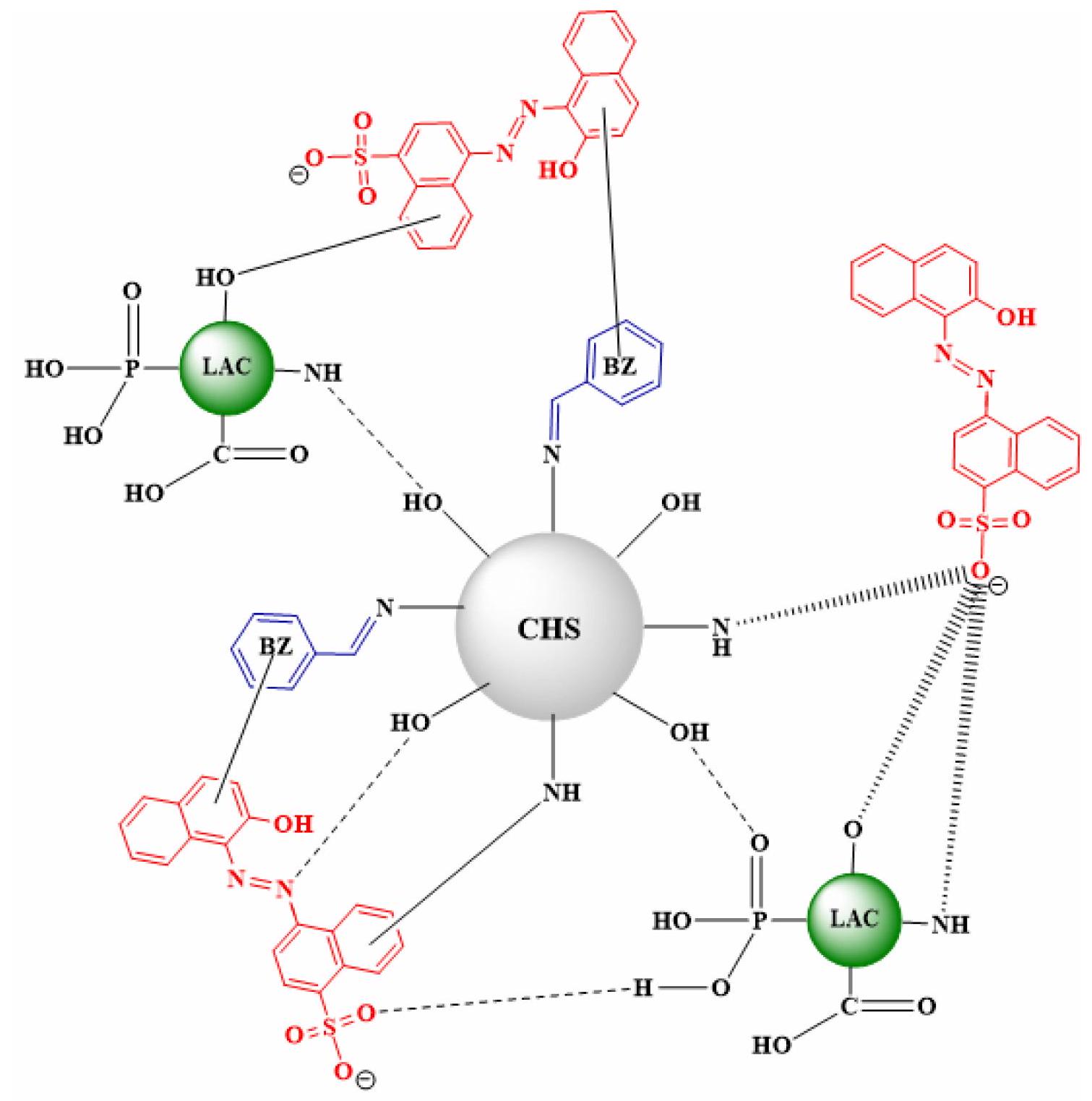 ) من صبغة AR88 أنتجت الجذب الكهروستاتيكي. تلعب تفاعلات الهيدروجين دورًا حاسمًا في آلية الامتزاز لصبغة AR88. تحدث التفاعلات بين ذرات الهيدروجين على الهيكل السطحي لـ CHS-BZ/LAC وذرات الأكسجين والنيتروجين في هيكل صبغة AR88 [61، 62].