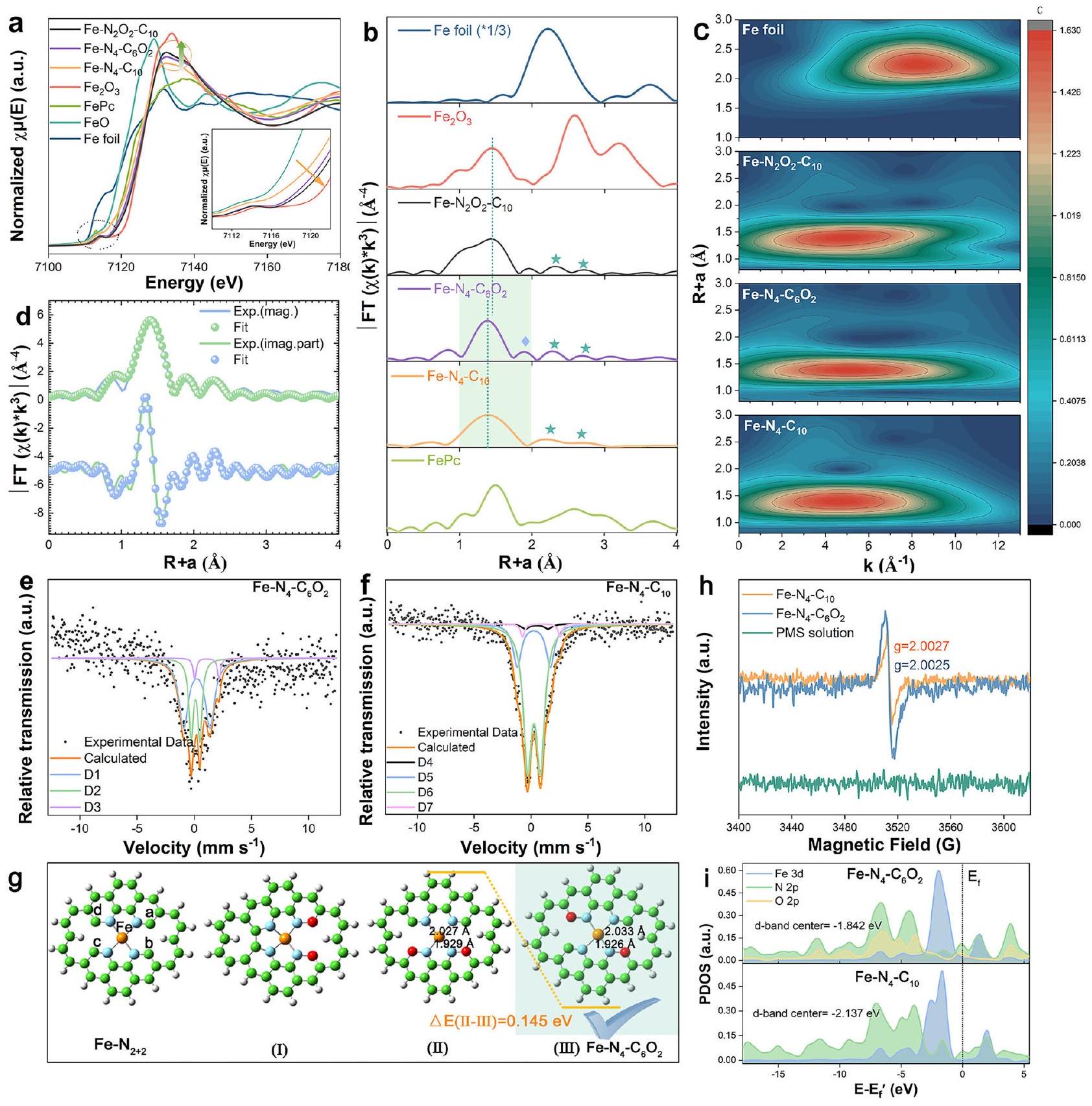الشكل 2 | التوصيف الطيفي والحساب الهيكلي للعوامل المساعدة. أ XANES (الإدراج: عرض مكبر لـ XANES)، ب طيف FT-EXAFS (-الموزونة)، و c طيف WT-EXAFS لأوراق الحديد المختلفة و Fe-SACs. d منحنى التناسب في فضاء R لـ EXAFS المقابل لـطيف مويسباور لـ وفي-. الهندسيّات المحسّنة لثلاثة أنواع ممكنةهيكل الموقع النشط. طيف EPR وPDOS لـ Fe-SACsتُقدم بيانات المصدر كملف بيانات مصدر. الأنواع ولتمثيل الأنواع الثلاثة المختلفة من ذرات الأكسجين في PMS (الأشكال التكميلية 11-12). كما هو متوقع، فإن الشحنة الإيجابية الأعلى لمركز الحديد وحقله الكهربائي المحلي القوي المحيط به فيعززت امتصاص PMS وأثارت الانقسام السريع للبروكسيد ) الرابطة ( الشكل 3أ)، بينما ساعدت الكثافة المنخفضة للإلكترونات في مركز الحديد على تعزيز تفاعله القوي مع إزاحة ذرة الحديد من مستوى الحامل وإطالة وروابط الحديد والأكسجين إلى قد يؤدي إلى إزالة المعادن. ومع ذلك، فإن تقليل الشحنة الموجبة على مراكز الحديد وحقله الكهربائي المحلي المحيط بها في و فشل في تلبية متطلبات الكسر المباشر لـالرابطة الناتجة عن امتصاصهم لـ PMS، وبالتالي قد تشكل معقدات (I) و (II) و (III) مع PMS عبر، و على التوالي (الشكل 3 أ والمكمل