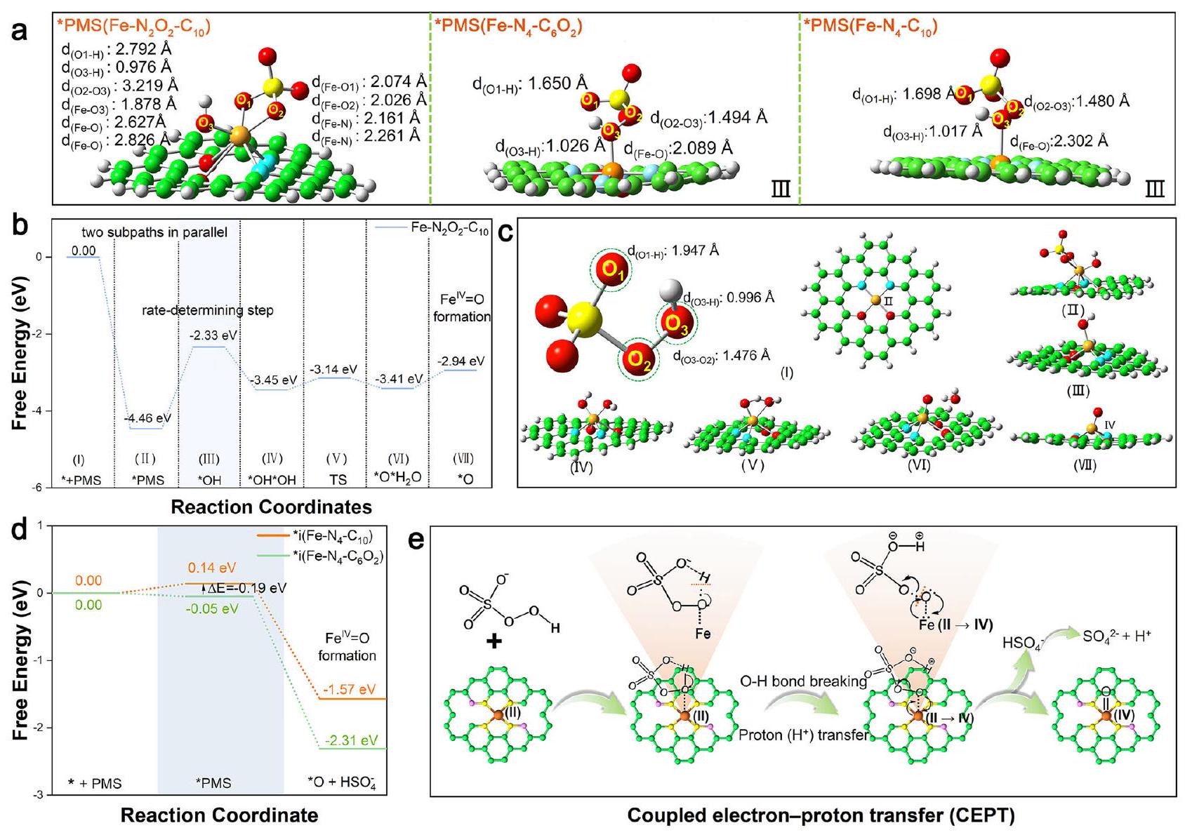بعد ذلك، يتم تشكيل الحديد الأكسو عالي التكافؤ ) والراديكالات في أنظمة Fe-SACs/PMS الثلاثة تم استكشافها نظريًا. كما هو موضح في الشكل 3b، c، كان من الممكن أيضًا من الناحية الديناميكية الحرارية توليد فيالنظام من خلال المسار التقليدي لـ(أنا) →متلازمة ما قبل الحيض (II) * OH (III) (الرابع) حالة الانتقال (TS، V). بشكل مختلف، المسافة المناسبة بين و H من *PMS( ) و *متلازمة ما قبل الحيض( ) سهلت تشكيل الروابط الهيدروجينية داخل الجزيء، والتفاعل بين الحديد وضعف و الروابط، مما يفضل انقسامها لإنتاج من خلال الاقتران غير الكلاسيكي