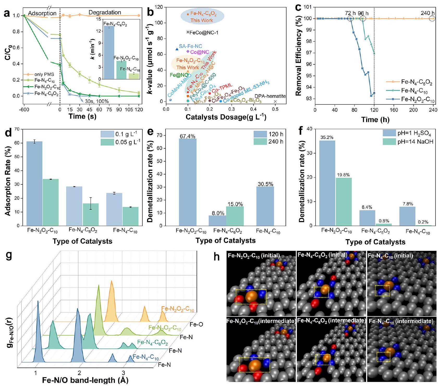 20 mg . d The adsorption rate of Fe-SACs on BPA at different dosages. The demetallation rates of different Fe-SACs after (e) continuous removal of BPA for 120 h and 240 h and (f) 36 h of corrosion by strong acids/bases. g Fe-N and Fe-O radical distribution function profiles of Fe-SACs at . h Snapshots of Fe-SACs obtained from MD simulations at . The initial configuration and an intermediate state are provided to show the elongation of the bond as marked by the yellow box. Source data are provided as a Source Data file.