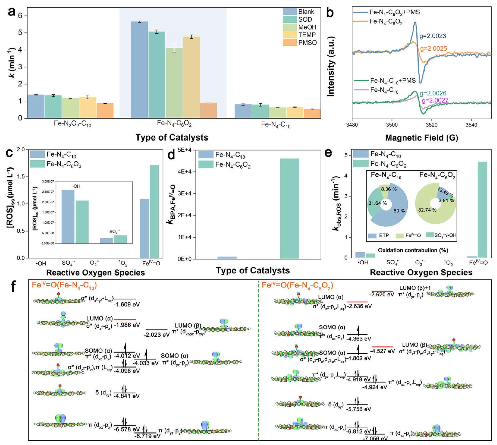 state concentrations of and ). d The second-order reaction rate between BPA and in the Fe-SACs/PMS system. e The observed reaction rate constants of ROS and BPA in the Fe-SACs/PMS system (inset: the oxidation contributions of different ROS to BPA degradation). f The molecular orbital composition and energy level of . The above illustration displays only the orbitals in the vicinity of the LUMO orbital. The N-Fe-N axis in where N is directly connected to O is defined as the x -axis. Source data are provided as a Source Data file. , respectively, which were orders of magnitude higher than that of and , strongly validating that / PMS and PMS were more likely to produce species rather than radicals, consistent with theoretical predictions. However, the second-order reaction rate constant of species produced in the system with BPA was only , much lower than that of the radicals , rendering the contribution of to the BPA oxidation to be only , much lower than those of ETP (60.0%) and radical oxidation (31.6%) (Fig. 5d, e and Supplementary Tables 8-9). These facts suggested that the species produced in the PMS system possessed low reactivity towards BPA. Surprisingly, the second-order reaction rate constant of species produced in the PMS system with BPA increased to -fold that of /PMS (Fig. 5d), suggesting that the O doping in the second