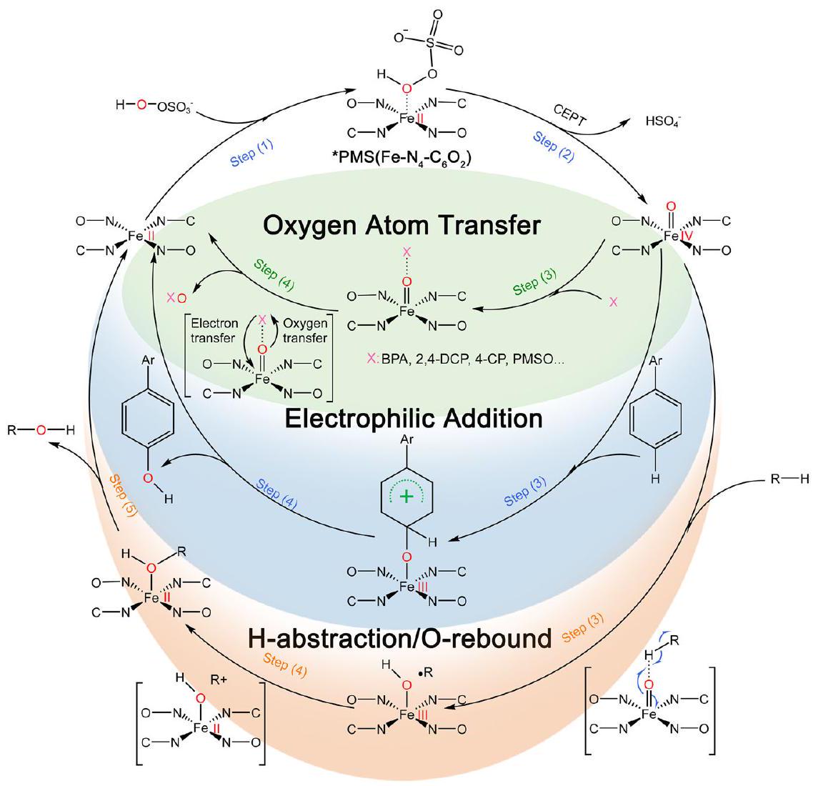 Fig. Reaction mechanisms diagram of with pollutants. The species oxidizes pollutants through the OAT reaction, electrophilic addition, and H-abstraction/O-rebound mechanism.