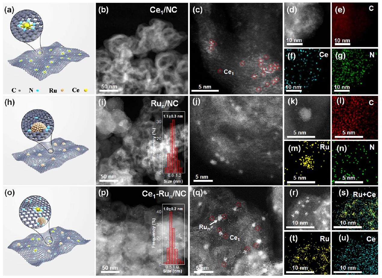 Likewise, we have characterized the and the catalysts via the microscopic techniques. As presented by the HAADFSTEM images of the catalyst in Fig. 2i-k, fully-exposed nanoclusters with an average particle size of were evenly dispersed on its NC support. The EDS elementary mapping images of a small nanocluster in the catalyst (Fig. 21-n) revealed its Ru element nature. The AC HAADF-STEM images of the catalyst in Fig. 2p-r showed that the mean particle size of the fullyexposed Ru nanoclusters in it was . Corresponding EDS elementary mapping images of the catalyst in Fig. 2s-u further indicated that the Ru element signal was concentrated on the small nanoclusters while the Ce element signal was highly overlapped with the distribution of single atoms, which suggestd the copresence of Ru nanoclusters and Ce single atoms in it. No diffraction peaks of Ru were identified for both of the catalyst and the catalyst as shown in Fig. S8 because of the ultrasmall Ru nanoclusters in them. The Ru loading amounts of the catalyst and the catalyst were both about (Table S1) while the Ce weight loading in the was as determined by the ICP-OES measurements.