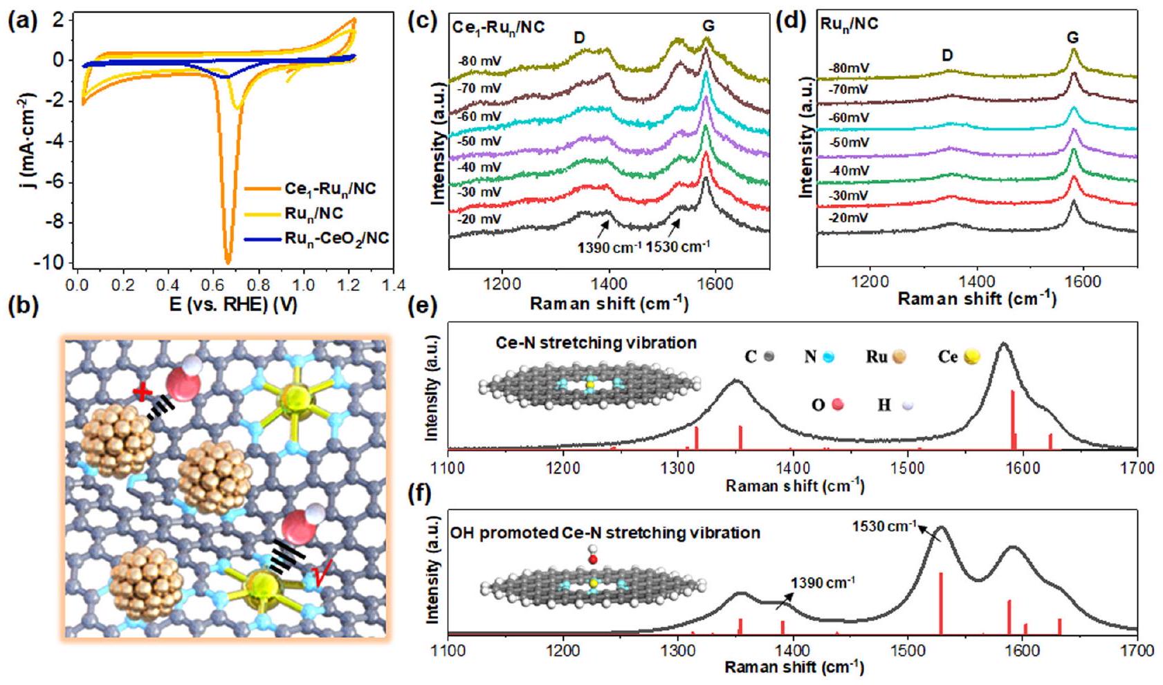 To further confirm this, we have performed the in situ Raman measurements in 1.0 M KOH electrolyte under real alkaline HER conditions (the instrument model was schematically illustrated in Fig. S23). As presented in Fig. 4c, the Raman vibration peaks at and of the catalyst were gradually intensified with the decrease of reaction potentials during the alkaline HER process. By contrast, the catalyst merely showed the vibration peaks for the D band and G band of carbon support (Fig. 4d) under the same testing conditions . Since there was no record of the two Raman vibration peaks of the catalyst at and , we have further conducted the theoretical simulations for assigning the two peaks. Through theoretical fitting of the Raman spectrum of the catalyst before alkaline HER test (Fig. 4e), we found that the Raman vibration peaks at and were assigned to the stretching vibration in it but the two peaks were very weak before the alkaline HER test. Thus, it was reasonable to assume that the strengthening of the Raman vibration peaks at and was related to OH or H produced during the alkaline HER process. To this end, we have examined both OH and H effects on the Ce-N stretching vibration. Strikingly, upon introducing OH to the sites of the catalyst, corresponding Raman peak intensities at and were significantly strengthened as shown in Fig. 4f, agreeing well with the in situ Raman spectra in Fig. 4c. By comparison, it was manifested in Fig. S24 that H had a negligible impact on intensifying the stretching vibration at and . Evidently, OH was more prone to bond with the Ce single atoms of the catalyst during the alkaline HER and in turn made the fully-exposed Ru nanoclusters therein serve as hydrogen evolution centers, hence realizing the active site reverse for hydrogen evolution relative to the catalyst.