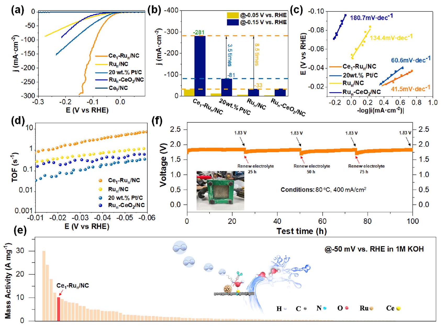 In conclusion, we report that uniting highly oxophilic Ce single atoms and fully-exposed Ru nanoclusters on a N functionalized carbon support can efficiently reverse the alkaline hydrogen evolution centers to the more active nanocluster side, which largely boosted the alkaline HER activity of the catalyst. The facile active site reverse for hydrogen evolution was well confirmed both by the CV, in situ Raman measurements and the theoretical calculations. Notably, the mass activity of the catalyst ( at -0.05 V ) was superior to most of the reported Ru-based alkaline HER catalysts to date. In the meanwhile, the chronopotentiometry measurement performed on an AEMWE device further unveiled its excellent durability, which displayed great potential for practical applications. This finding possibly provides new insights into designing highly effective alkaline HER catalysts by rationally regulating the hydrogen evolution centers.