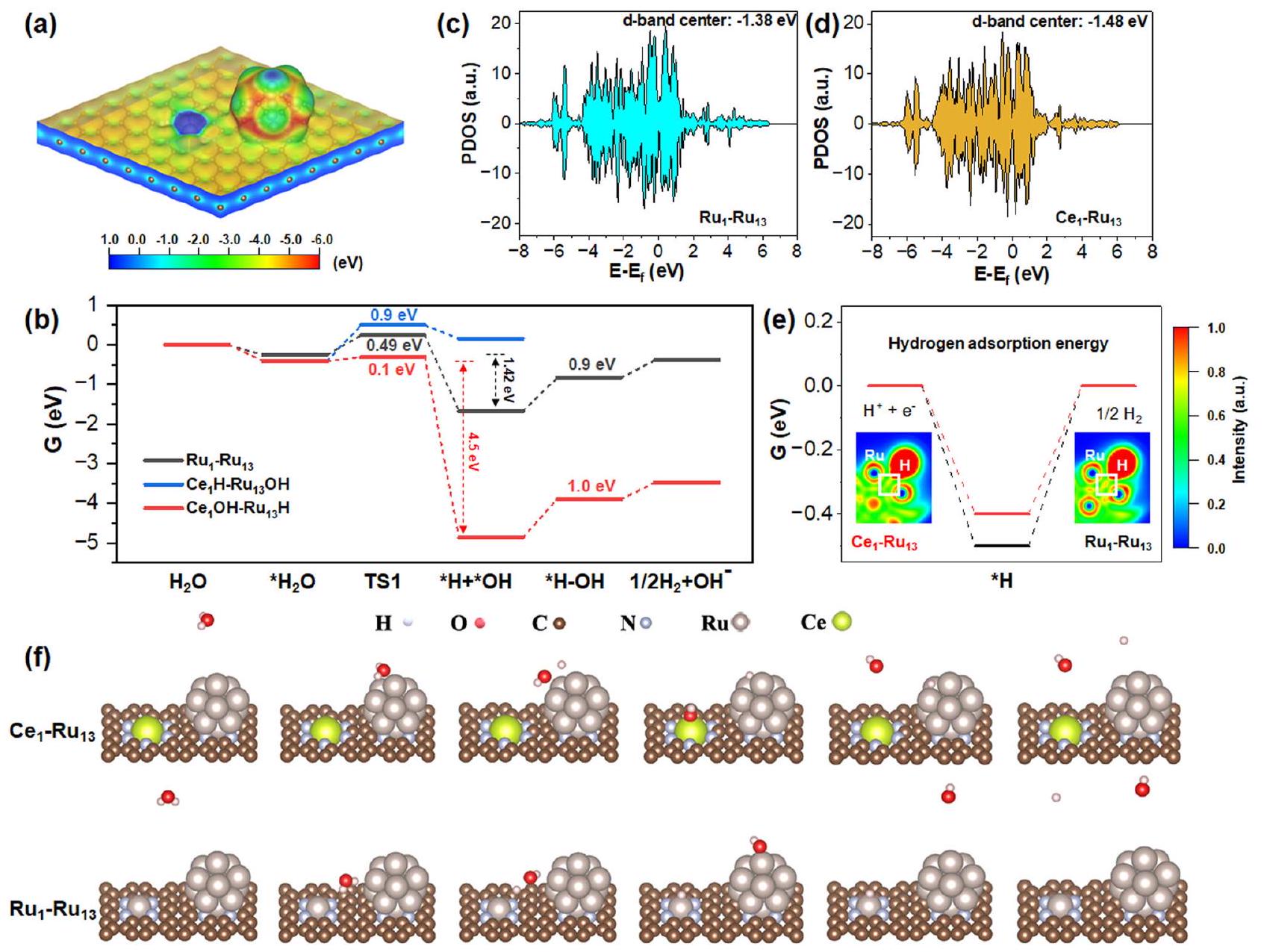 Figure 6a shows that the catalyst possessed a microelectric field due to the notable difference in the electrostatic potential distribution between the Ce single atoms and the fully-exposed Ru nanoclusters. Consequently, the water molecules could be easily