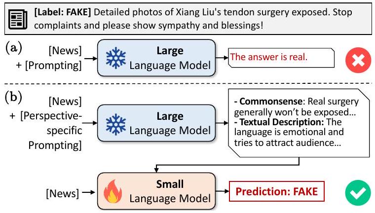 للإجابة على هذين السؤالين، نجري أولاً تحقيقًا عميقًا في الدور الفعال لـ LLMs في اكتشاف الأخبار المزيفة ونحاول تقديم حل عملي يتضمن LLM. على عكس الأعمال المعاصرة (بيلرين وآخرون، 2023؛ كارامانسيون، 2023) التي تطلب ببساطة من LLMs تقديم توقعات مع تعليمات المهمة، نجري دراسة تجريبية مفصلة لاستخراج إمكانيات LLMs. على وجه التحديد، نستخدم أربعة أساليب تحفيز نموذجية (تحفيز بدون عينة/تحفيز قليل العينة/تحفيز سلسلة الأفكار) لطلب من LLM إصدار أحكام حول صحة العناصر الإخبارية المعطاة (الشكل 1(أ)) ونجد أن حتى أفضل طريقة تعتمد على LLM لا تزال أقل أداءً من SLMs المعدلة الخاصة بالمهمة. ثم نقوم بتحليل المبررات التفسيرية التي تم إنشاؤها بواسطة LLM ونجد أن LLM يمكن أن تقدم مبررات معقولة ومعلوماتية من عدة زوايا. من خلال تحفيز LLM بعد ذلك بمطالب محددة للزوايا وأداء تجميعات قائمة على القواعد للأحكام، نجد أن المبررات تفيد بالفعل اكتشاف الأخبار المزيفة، وننسب الأداء غير المرضي إلى عدم قدرة LLM على اختيار ودمج المبررات بشكل صحيح.