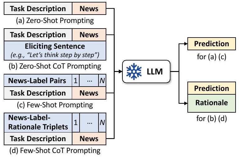 -shot settings, we choose 4-shot prompting which includes two real and two fake samples. - Few-Shot CoT Prompting (Wei et al., 2022b) not only provides news-label examples but also demonstrates reasoning steps with previously written rationales. Here, we obtain the provided rationale demonstrations from the correct and reasonable outputs of zero-shot CoT prompting.