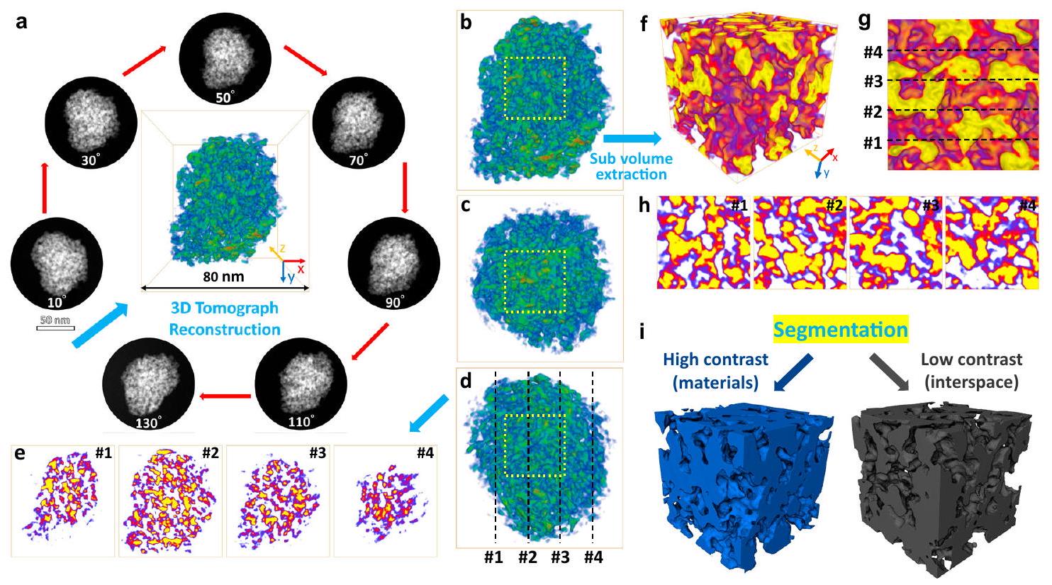 للحصول على مزيد من الفهم حول البيئة الدقيقة الداخلية لـ MD-تم إجراء إعادة بناء التصوير المقطعي. كما هو موضح في الفيلم التوضيحي الإضافي 1، تم جمع حوالي 90 صورة STEM-HAADF لإعادة بناء التصوير المقطعي لموقع تمثيلي بواسطةفترة، يفضل أن تكونتُعرض الوحدات الهيكلية المعاد بناؤها وبعض صور HAADF عند زوايا دوران مختلفة في الأشكال 2a و S9. الشكل المعاد بناؤه من الأمام يشبه تقريبًا صورة HAADF الملتقطة عند الزوايا المتوسطة. )، مما يثبت فعالية وموثوقية هذا الإعادة البناء. الشكل 2ب-د يعرض صور العرض الأمامي، العلوي والجانبي لوحدة الإعادة البناء، وطول ( المحور)، العرض ( المحور) والارتفاع ( محاور) صندوق الربط هي 80 و80 و120 نانومتر، على التوالي. علاوة على ذلك، يتم تقديم تباين الحجم في وضع الألوان الفيزيائية حيث يمثل الحجم باللون الأزرق/ الأخضر تباين HAADF مرتفع/ منخفض نسبيًا. نظرًا لأن المحفز يحتوي فقط علىالمكون، التباين العالي والمنخفض في الهيكل يتوافق معالجزيئات النانوية والمسافة بين الفضاء، على التوالي. الشريحة الأفقية التمثيلية (الشكل 2e) المحددة بخط متقطع أسود في العرض الأيمن لوحدة الإعادة البناء (الطائرات، عمودية علىمحور عند ) تشير بشكل أكبر إلى وجود نانو مفاعلات فريدة ثنائية الاستمرارية تتكون من نانوية فائقة الدقة النانو مونو ميرات والمسامات الداخلية. بالإضافة إلى ذلك، يتم عرض عملية الدوران والترشيح والتقطيع العمودي الديناميكية للجسيم المعاد بناؤه من أجل رؤية أفضل (فيلم إضافي 2).