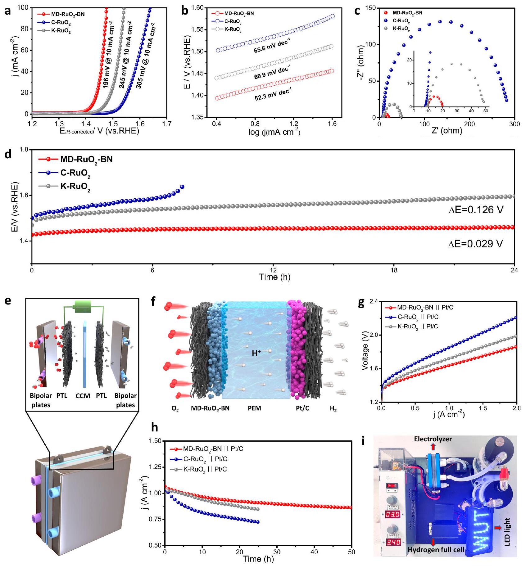 يوضح منحنى الاستقطاب (الشكل 4g) لأجهزة التحليل الكهربائي للمياه باستخدام أغشية البوليمر (PEMWEs) أنه للوصول إلى كثافة تيار قدرهالتحليل الماء، MD-RuO-BN-PEM-Pt/ C معكعامل حفاز للأنود يتطلب فقط جهد خلية قدره 1.64 فولت، وهو أفضل من تلك الخاصة بـ K-RuO.-PEM-Pt/C ( ) و بالإضافة إلى ذلك، اخترنا 1.65 و 1.72 و 1.85 فولت كجهد ثابت لاختبارات الاستقرار، والذي ينبغي أن ينتجاستنادًا إلى LSV. تكشف منحنيات كثافة التيار المعتمدة على الزمن (الشكل 4 هـ) أن MD--الخلية الكهروكيميائية المعتمدة على BN تحافظ بشكل جيد على نشاط التحليل الكهربائي للماء لمدة 50 ساعة، بينما كلا و تجارب تراجع واضح في غضون 25 ساعة فقط من التشغيل، خاصة. هذا يثبت بشكل أكبر الاستقرار المحسن لتصميمناالمحفزات. علاوة على ذلك، توضح الشكل S39 أنه لا يوجد انفصال لـ MD-طبقة التحفيز على الأنود بعد التشغيل عندلمدة 50 ساعة. وتظهر المورفولوجيا العرضية والمستوية للMEA أن طبقة التحفيز وبنية الغشاء محفوظة بشكل جيد (الشكل S40). أخيرًا، صممنا نظام خلية وقود متجددة يجمع بين الإلكتروليزر المصنوع ذاتيًا وخلية وقود الهيدروجين التجارية (الأشكال 4i وS41 والفيلم التكميلي 5). تشير إضاءة الصمام الثنائي الباعث للضوء إلى تحقيق إعادة تدوير خضراء للهيدروجين القادم من الماء ثم العودة إلى الماء.