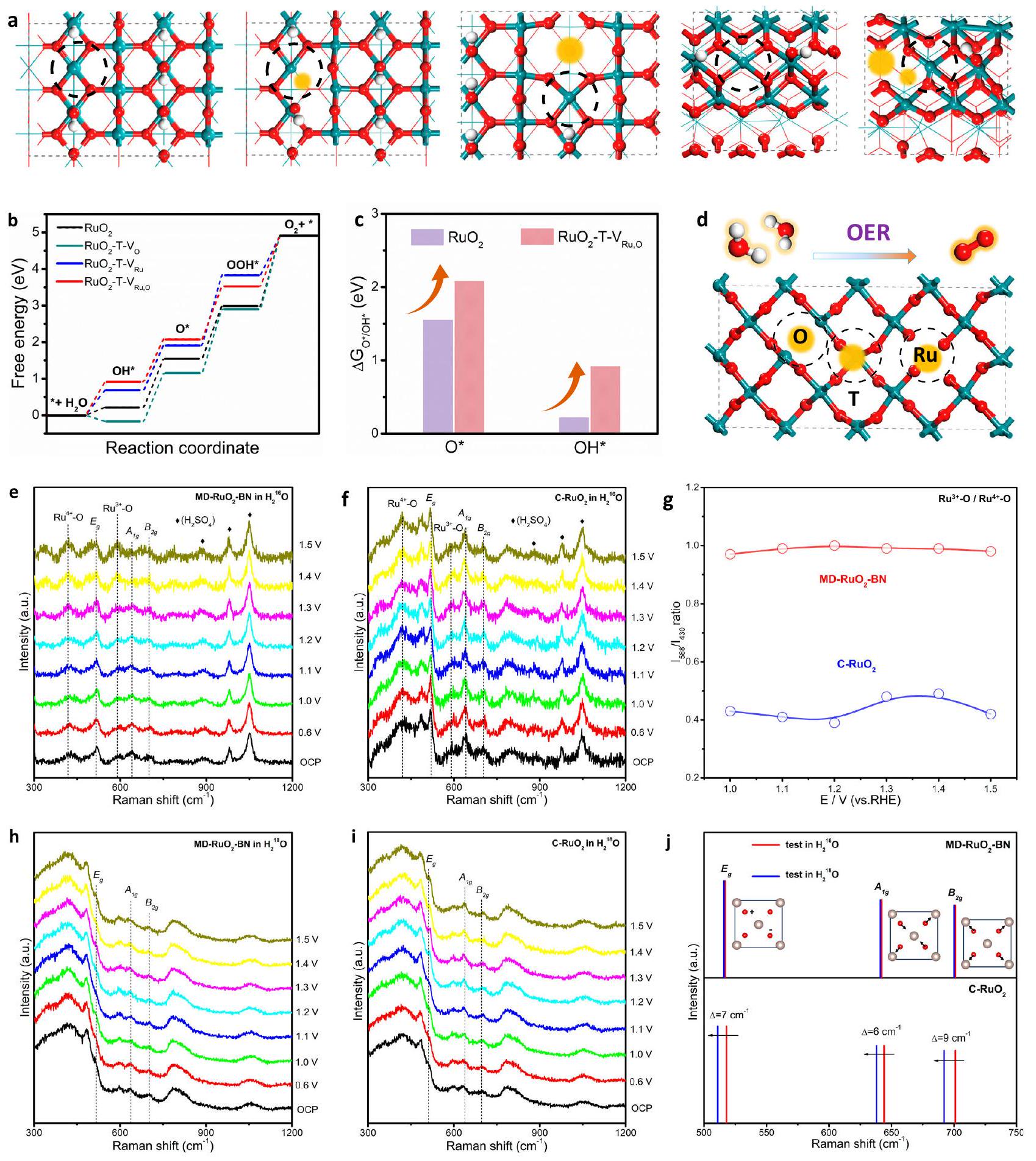 قمنا أيضًا بإجراء رامان في الموقع فيموسوم (الشكل 5هـ، و). من خلال مقارنة تحول أوضاع الاهتزاز المميزة نُسِب إلىفي العادي والمُعَدَّة بالملصقات، يمكن أن يُعثر علىيظهر درجة معينة من الإزاحة السلبية عند و (الشكل 5j). ويرجع ذلك أساسًا إلى تبادل الأكسجين الشبكي في معفي الإلكتروليت عند جهد مطبق، مما يؤدي إلى تغيير في تردد الاهتزاز الناتج عن الاستبدال الجزئي لشبكة الروثينيوم-مع رو-بينما لا يُلاحظ أي تأثير نظائري في MD-RuO-BN بسبب انخفاض حالة الأكسدة للروثينيوم، والتفاعل الضعيف بين الروثينيوم والأكسجين يقلل من مشاركة الأكسجين الشبكي. توفر النتائج المذكورة أعلاه رؤى حول تحسين الاستقرار لـ MD-RuO.-BN من التغيرات في بنية السطح في الموقع.