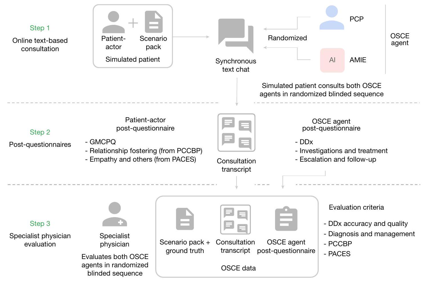 تُلخص مساهماتنا الرئيسية (الشكل 1) هنا. قدمنا أولاً AMIE (مستكشف الذكاء الطبي الواضح)، وهو نظام ذكاء اصطناعي قائم على نموذج اللغة الكبيرة مُحسّن لجمع التاريخ الطبي والحوار التشخيصي. لتوسيع نطاق AMIE عبر مجموعة متنوعة من التخصصات والسيناريوهات، قمنا بتطوير بيئة حوار تشخيصي محاكية تعتمد على اللعب الذاتي مع آليات تغذية راجعة تلقائية لتعزيز وتسريع عملية تعلمه. كما قدمنا استراتيجية سلسلة الاستدلال لتحسين دقة تشخيص AMIE وجودة المحادثة. ثم قمنا بتطوير مقياس تقييم تجريبي لتقييم جمع التاريخ الطبي، والتفكير التشخيصي، ومهارات التواصل، والتعاطف في الذكاء الاصطناعي الطبي الحواري، مع الأخذ في الاعتبار مقاييس تركز على الأطباء وأخرى تركز على المرضى. بعد ذلك، صممنا وأجرينا دراسة موضوعية منظمة سريرية (OSCE) معتمدة على التعمية عن بُعد (الشكل 2) باستخدام 159 سيناريو حالة من مقدمي الرعاية السريرية.