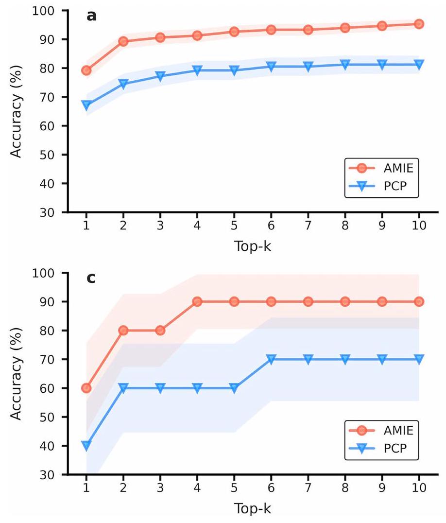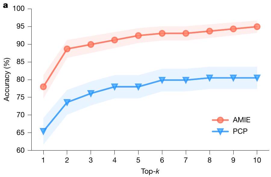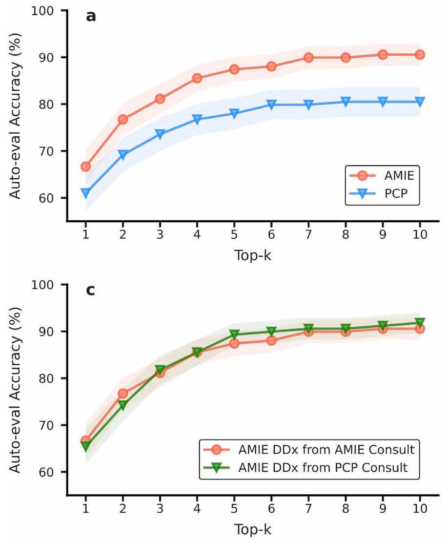 تم تقييم دقة تشخيص AMIE على أنها أعلى من دقة الأطباء العامين. الشكل 3 يوضح الأعلى-الدقة لـ AMIE و PCPs، مع الأخذ في الاعتبار المطابقات مع التشخيص الحقيقي (الشكل 3أ) والمطابقات مع أي عنصر في التفريق المقبول (الشكل 3ب). أظهرت AMIE دقة أعلى بشكل ملحوظ في القمة-دقة أكثر من تلك الخاصة بـ PCPs عبر جميع القيم لـ ( ). لاحظ أنه، على عكس AMIE، لم تقدم PCPs دائمًا عشرة تشخيصات في DDxs الخاصة بهم ( يعنيبالإضافة إلى ذلك، قمنا بإجراء مقارنة لدقة التشخيص التفريقي بين AMIE وأطباء الرعاية الأولية من خلال تغيير المعايير لتحديد التطابق (أي، يتطلب تطابقًا دقيقًا مقابل مجرد تشخيص ذي صلة عالية). النتائج الموضحة في الشكل التوضيحي الإضافي 2 تدعم بشكل أكبر أداء AMIE المتفوق في التشخيص التفريقي عبر معايير المطابقة المختلفة.