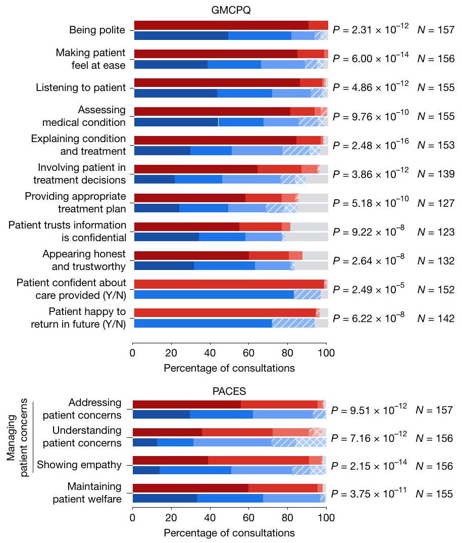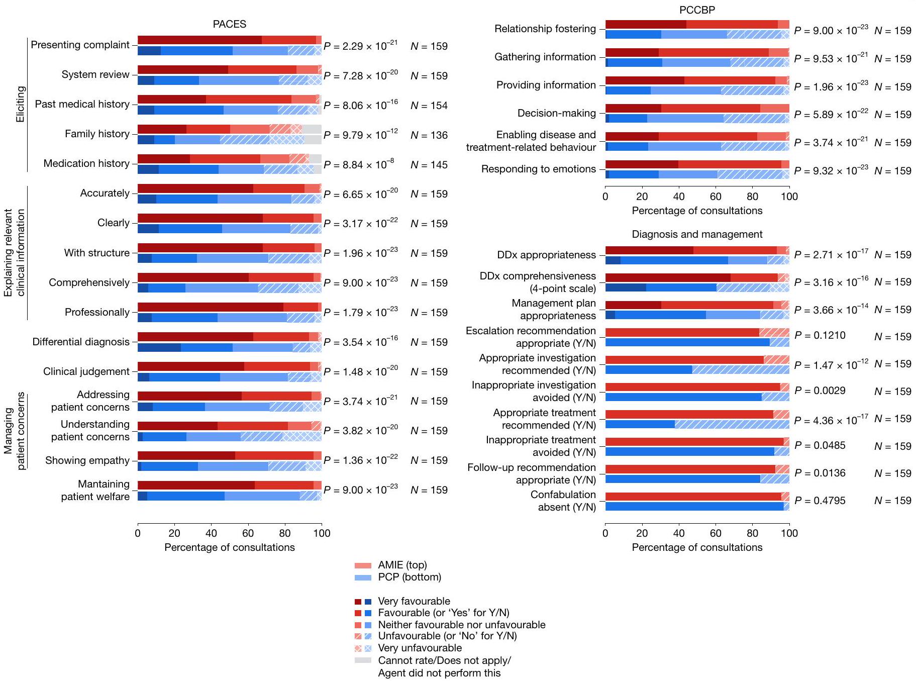 تقييمات الممثلين المرضى. الشكل 4 يعرض الصفات المختلفة للمحادثة التي قيمها الممثلون المرضى بعد استشاراتهم مع وكلاء منظمة الأمن والتعاون في أوروبا. بشكل عام، تم تقييم استشارات AMIE بشكل أفضل بشكل ملحوظ. ) من قبل الممثلين المرضى أكثر من أولئك مع مقدمي الرعاية الأولية عبر 25 من 26 محورًا. لم يتم الكشف عن اختلافات كبيرة في التقييمات لأحد محاور أفضل الممارسات في التواصل المتمركز حول المريض (PCCBP) الاعتراف بالأخطاءلذا، كان عدد الاستثناءات أعلى بكثير لأن هذا المعيار ينطبق فقط عندما تحدث أخطاء من قبل وكيل منظمة الأمن والتعاون في أوروبا وتم الإشارة إليها في المحادثة.