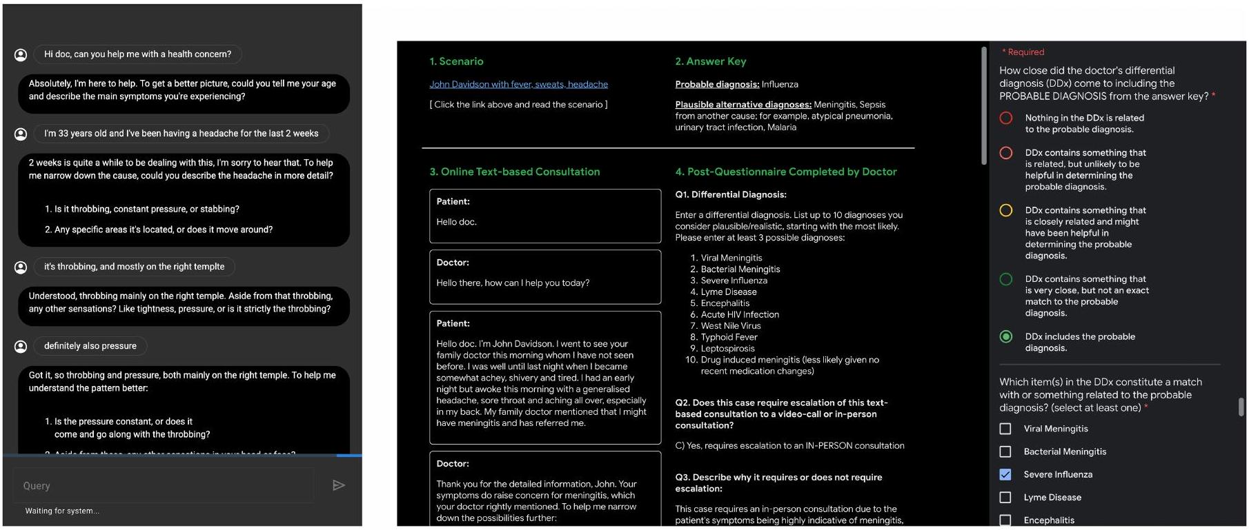 تحتوي أبحاثنا على قيود مهمة، وأهمها أننا استخدمنا واجهة دردشة نصية، والتي، على الرغم من أنها تتيح تفاعلًا محتملًا على نطاق واسع بين المرضى ونماذج اللغة الكبيرة المتخصصة في الحوار التشخيصي، كانت غير مألوفة للأطباء الممارسين في الاستشارات عن بُعد. لذلك، يجب ألا يُنظر إلى دراستنا على أنها تمثل الممارسة المعتادة في (الطب) عن بُعد.