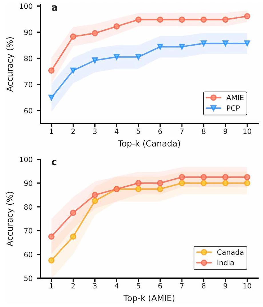 الدقة حسب الموقع. لاحظنا أن كل من AMIE و PCPs كان لديهما دقة تشخيصية أعلى في الاستشارات التي أجريت في مختبر OSCE في كندا مقارنة بتلك التي تمت في مختبر OSCE في الهند. ومع ذلك، لم تكن الفروق ذات دلالة إحصائية، وفي مجموعة فرعية من 40 سيناريو تم تنفيذها في كل من مختبرات OSCE في كندا والهند، كانت أداءات كل من AMIE و PCPs متكافئة (الشكل 4 من البيانات الموسعة).