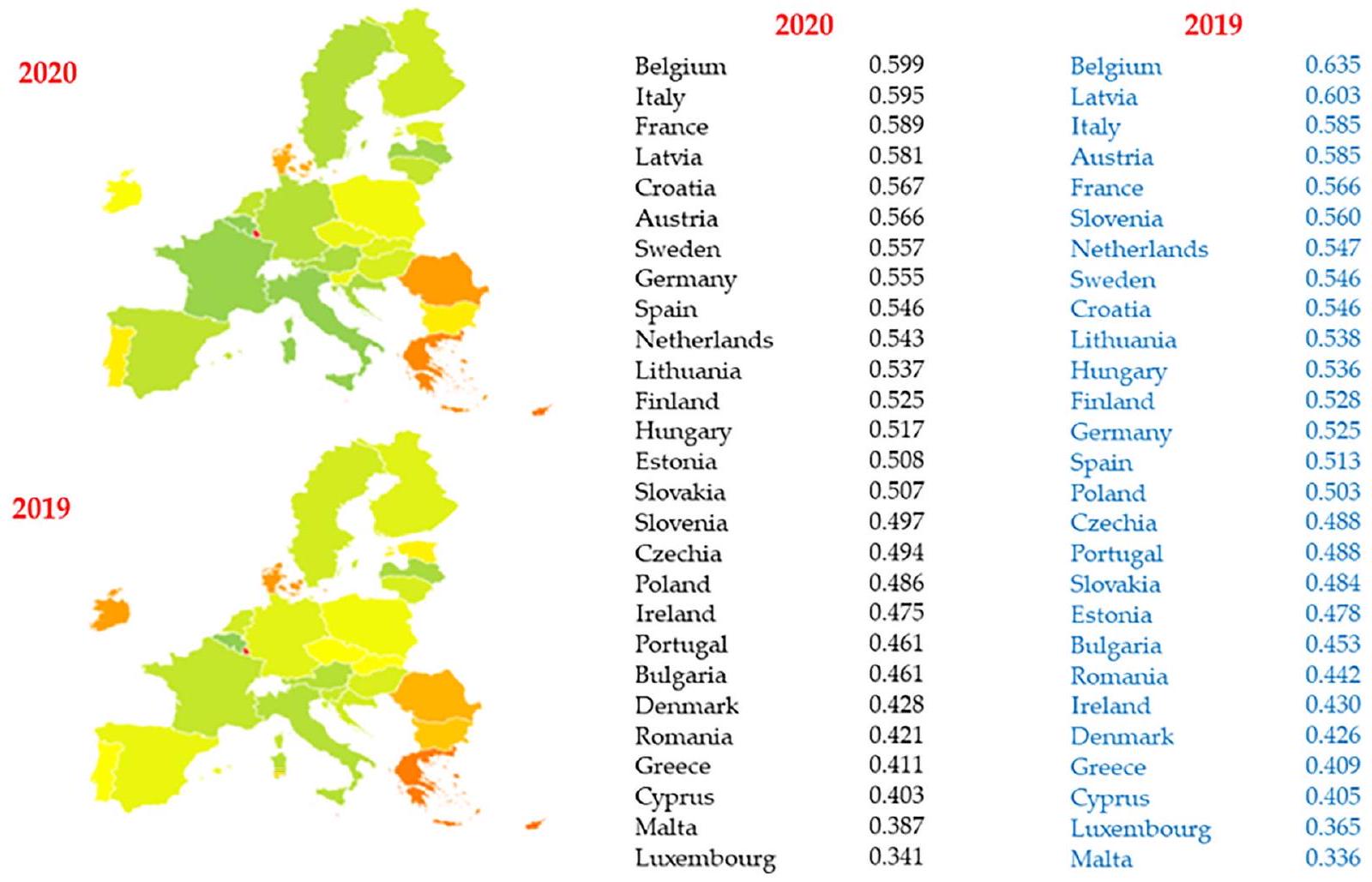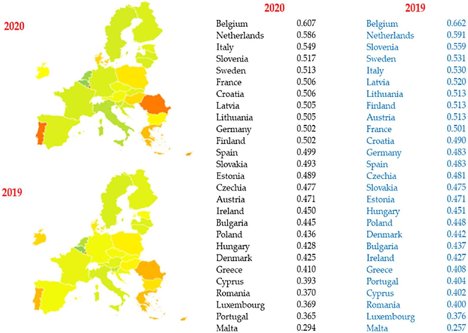 أكبر زيادة ملحوظة هي مالطا (+0.0509) تليها أيرلندا (+0.0445) وإسبانيا (+0.0326). الأداء الضعيف في عدة مؤشرات أدى إلى احتلال قبرص ومالطا ولوكسمبورغ المراتب الأخيرة في الترتيب الأوروبي.